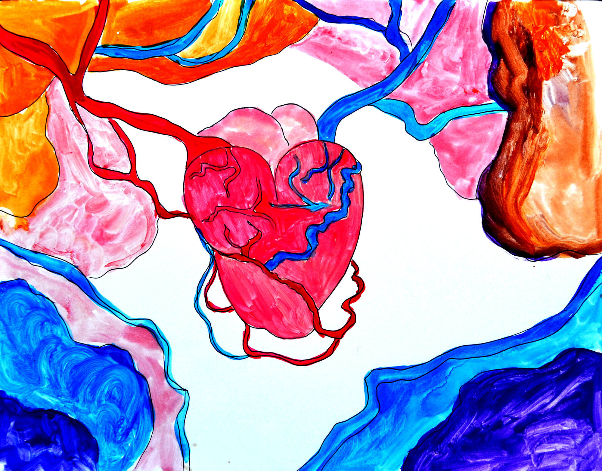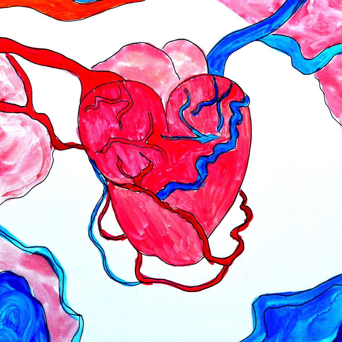 Ilustración con un corazón y las venas rojas y azules. El corazón está dentro del cuerpo humano, junto a los órganos. Colores rojos, azules, violetas y ocres. Descarga el archivo de imagen en formato JPG.