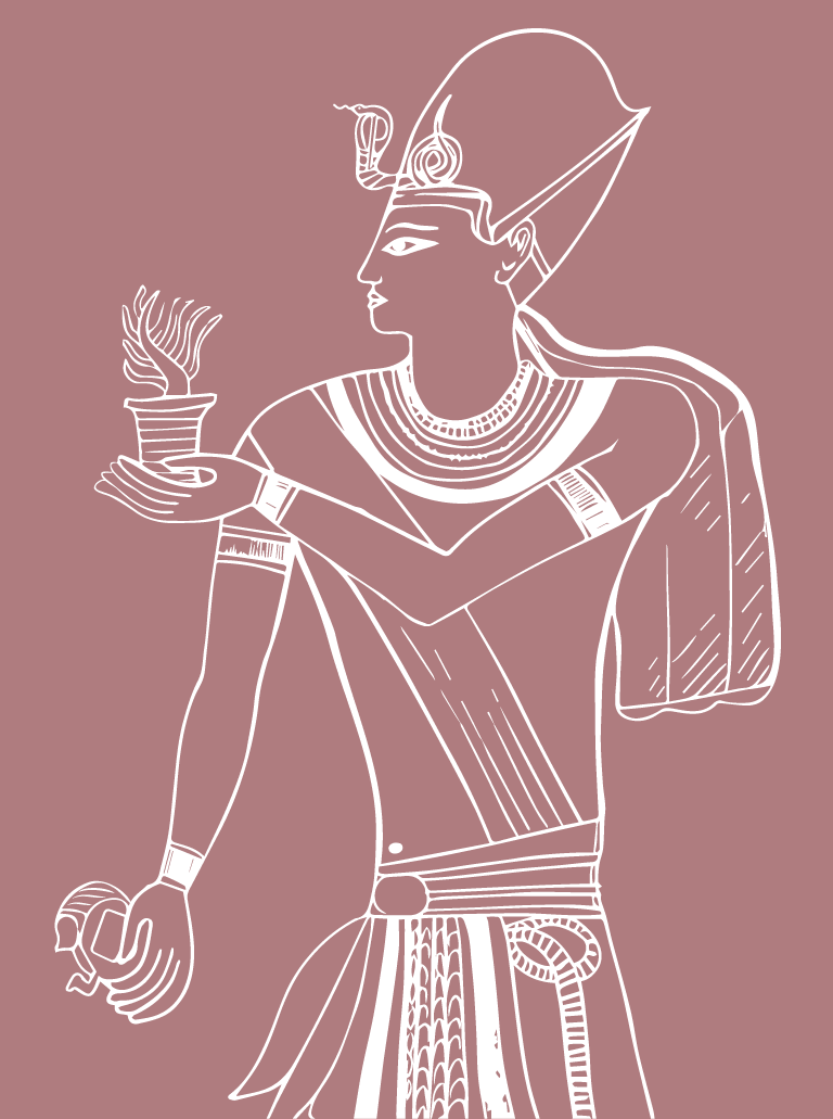 Dibujo egipcio con la figura del faraón sosteniendo en su mano una pequeña planta, símbolo de vida y agricultura. Lleva el atuendo de faraón, con la serpiente en su cabeza. Descargar el archivo en formato SVG vectorial, escalable y editable para modificar la ilustración y adaptarla a tu diseño.