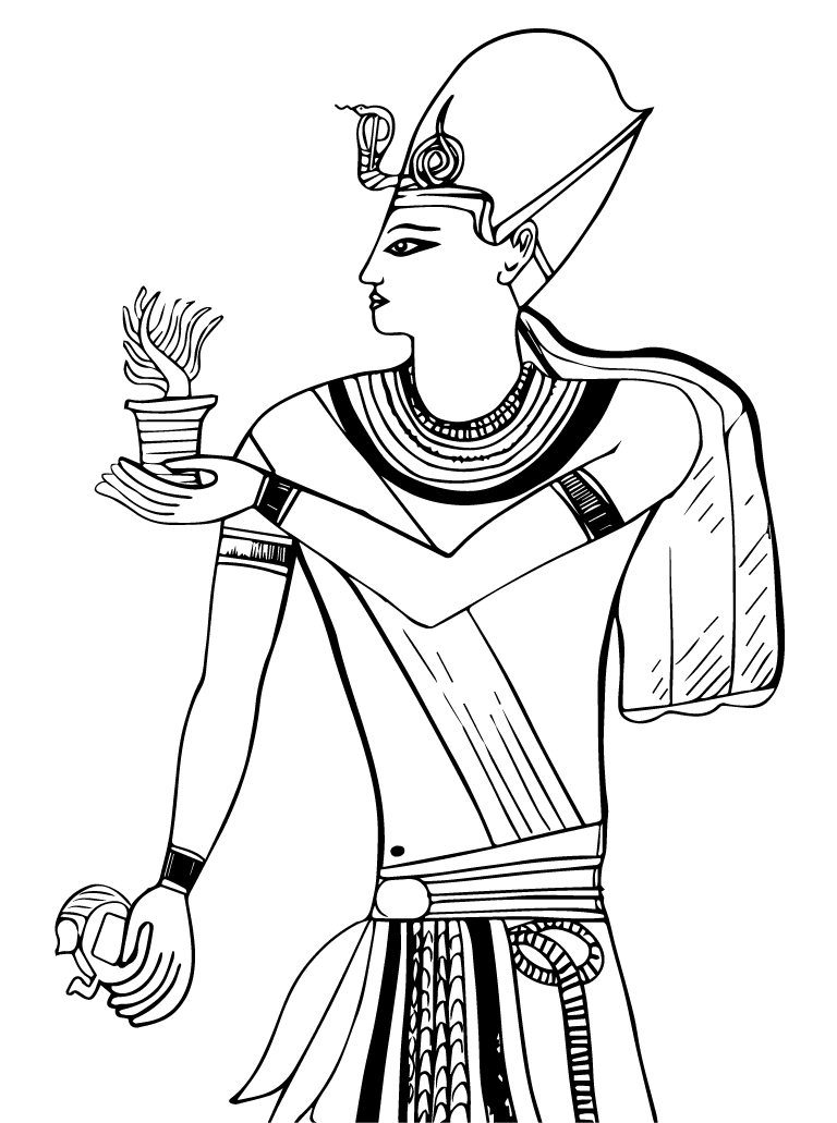 Drawing with the figure of a Egyptian Pharaoh, holding in his hand a small plant, symbol of life and agriculture. Wears the garb of a pharaoh, with the snake on his head. Download file in vector, scalable and editable SVG format to modify and adapt your illustration design.