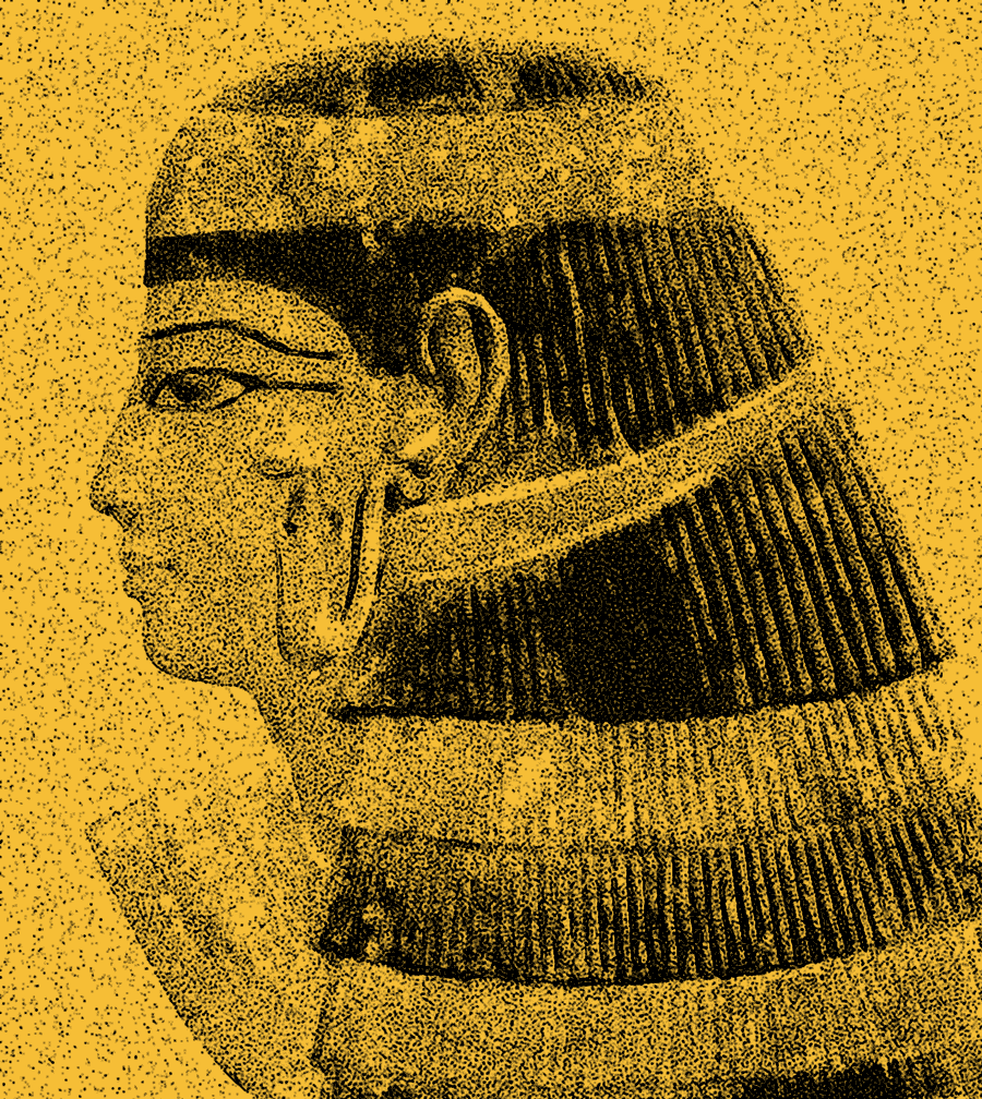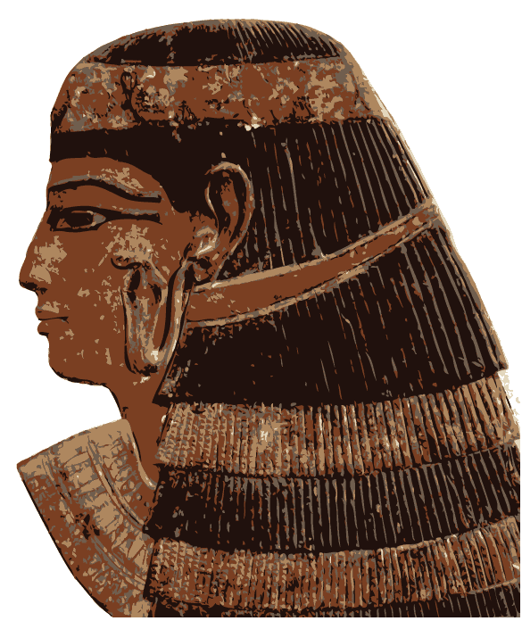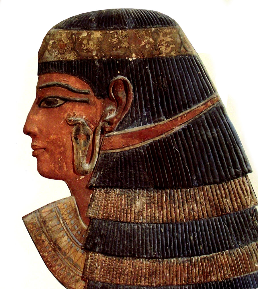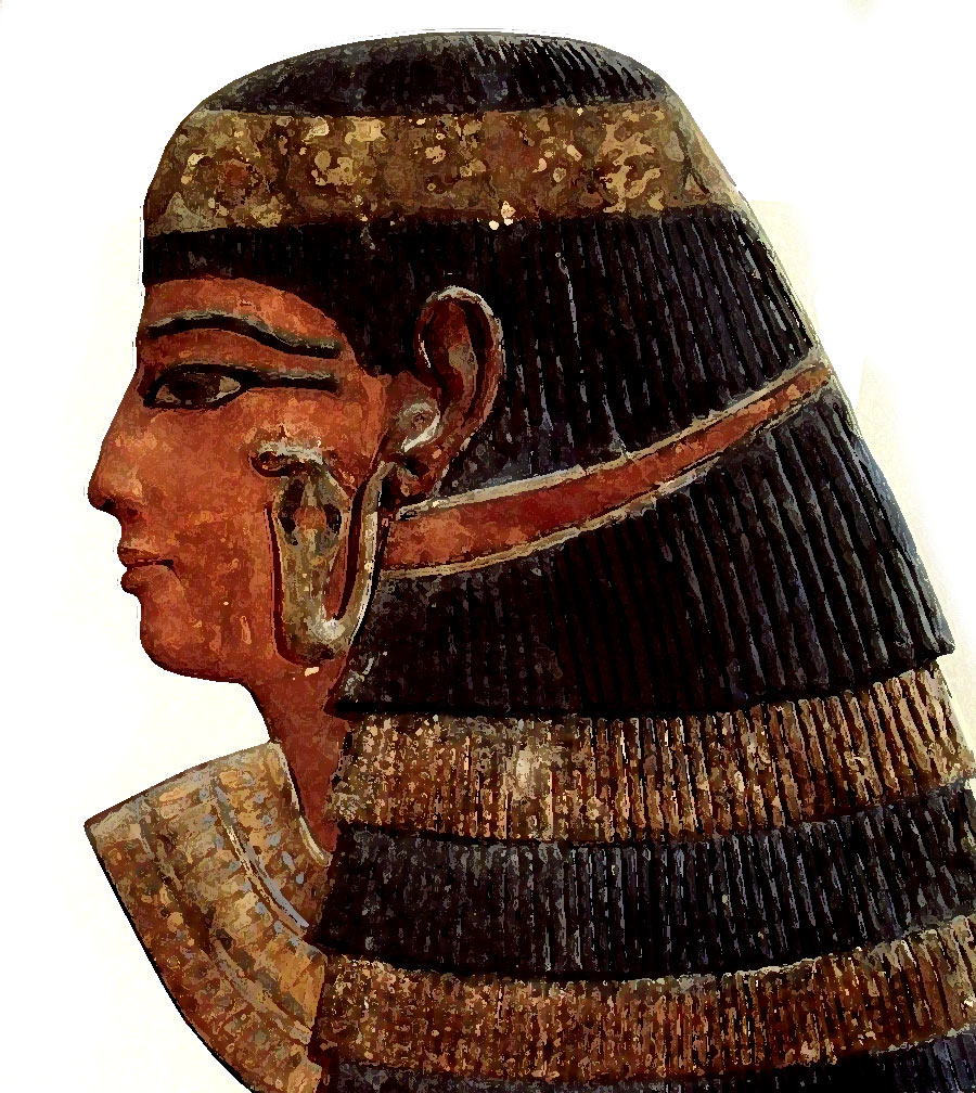 Este busto de mujer es una escultura egipcia de bajorrelieve pintado. En el templo de Mentuhotep II, en Deir el-Bahari, hay un santuario dedicado a la diosa Hathor, que además de ser diosa de la alegría, el amor y la música, era venerada por ser protectora de los difuntos. Esta ilustración muestra el rostro de la diosa Hathor del antiguo Egipto.