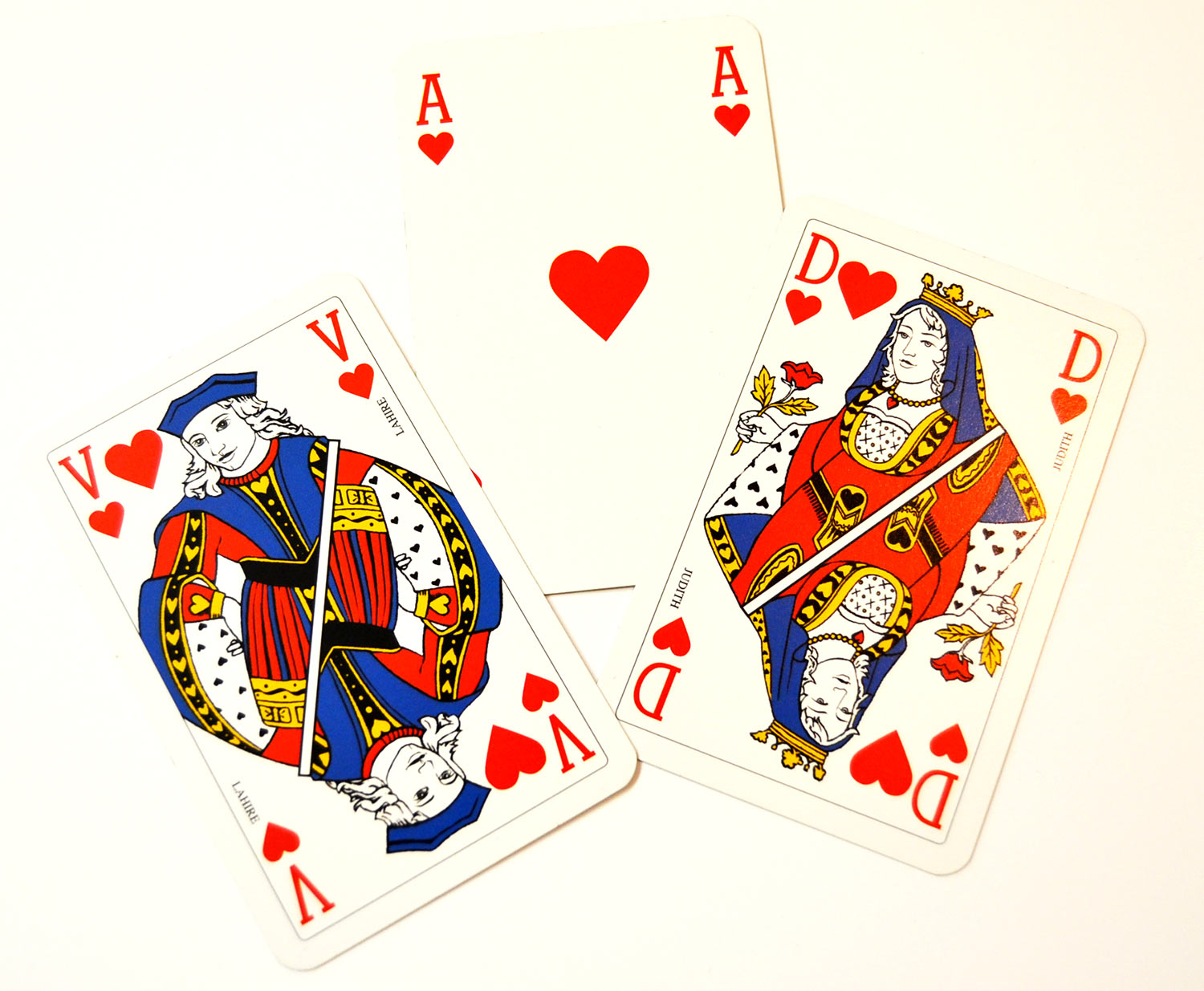 Composición fotográfica con tres cartas: dama de corazones, caballero de corazones y as de corazones. Cada carta con la ilustración de su figura que ocupa toda la carta.