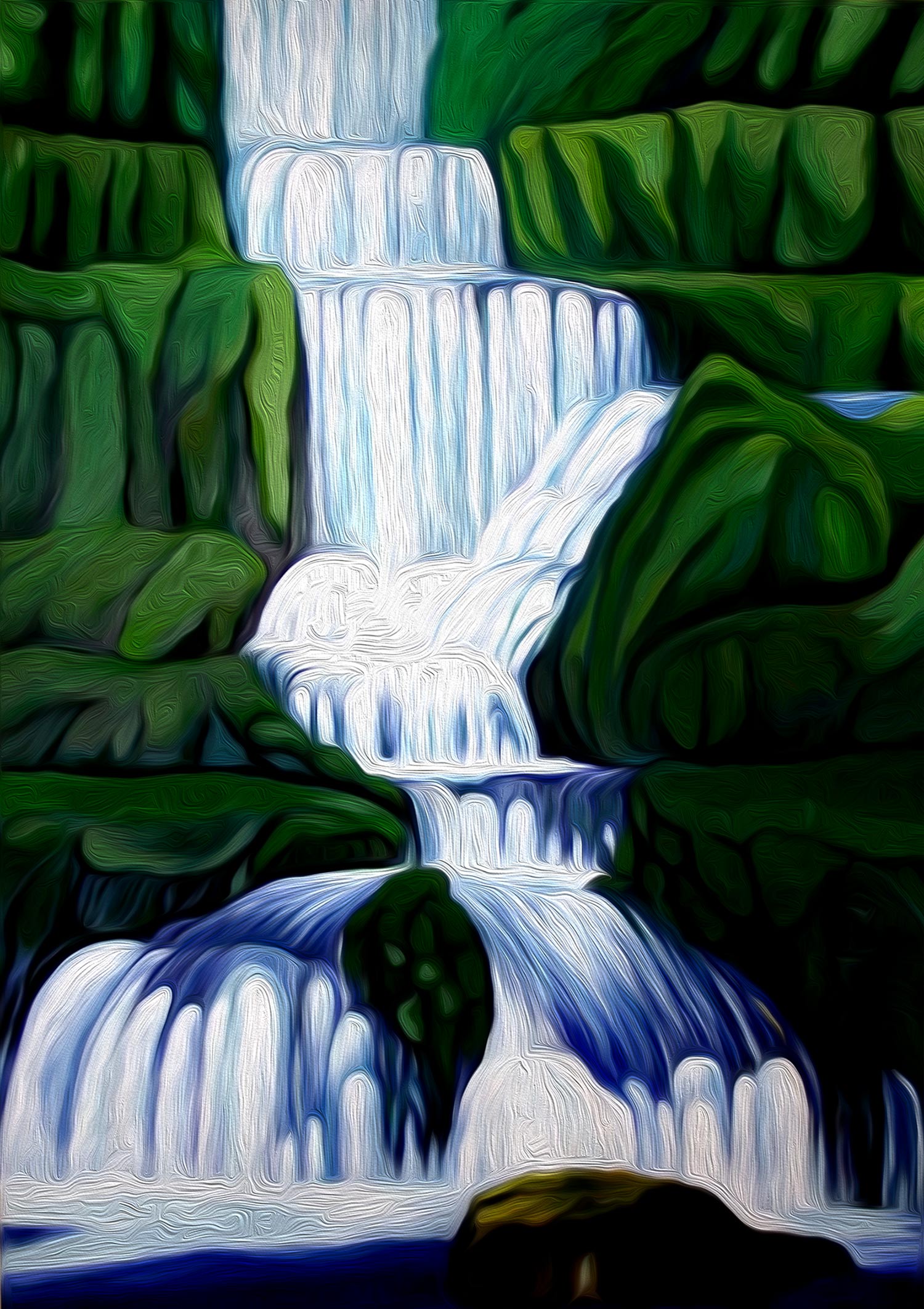 Pintura digital de una cascada de agua. Una ilustración con la caída de las aguas en la montaña