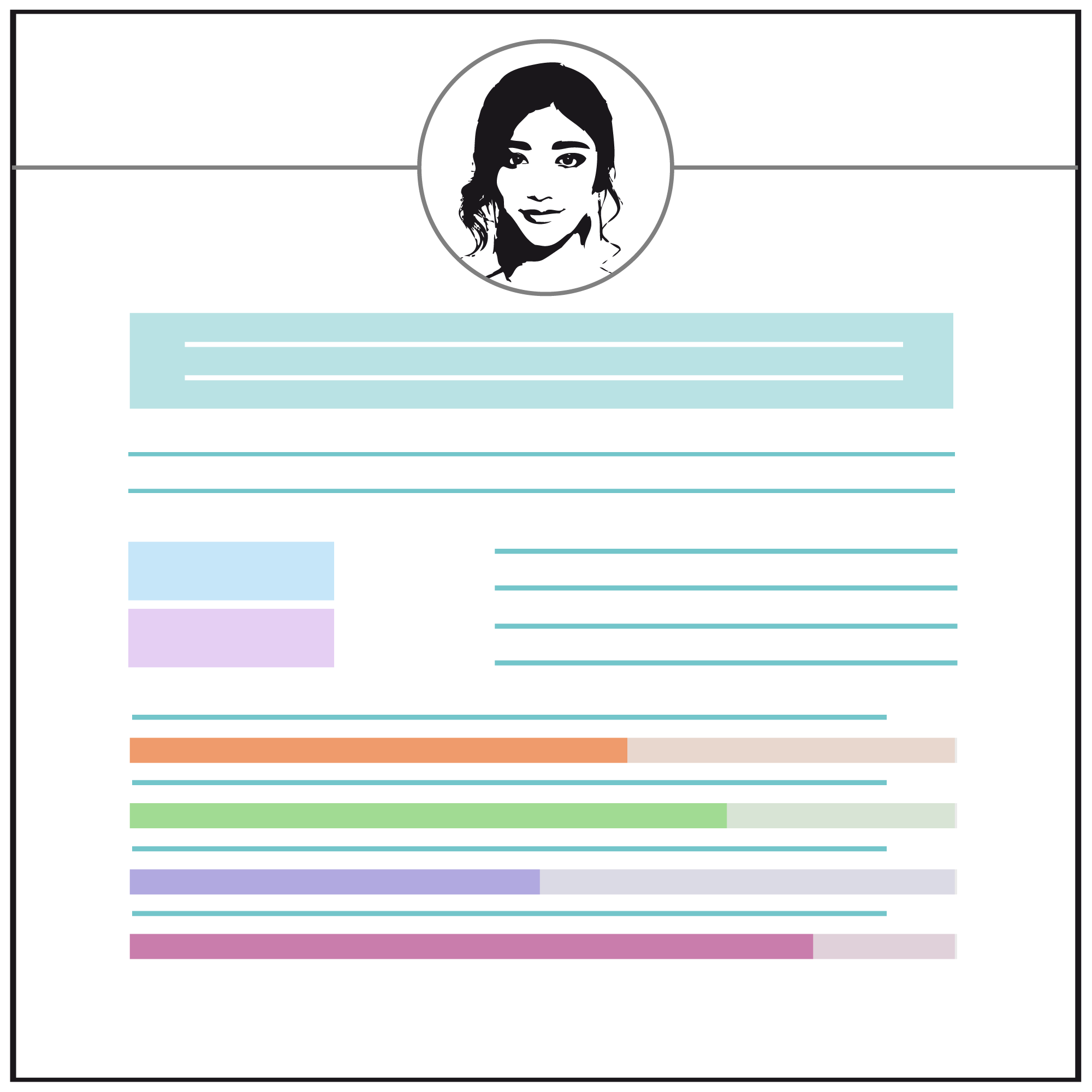 Ilustración que sirve para ilustrar el concepto de Persona del diseño UX (User Interfaces). Se trata de un diseño gráfico con la foto de una mujer joven y los bloques de texto o imagen de un curriculum vitae. En las fichas de diseño de las Personas se establecen preguntas y respuestas, gráficos de valoraciones y características, aspectos que definen el perfil de esa persona.