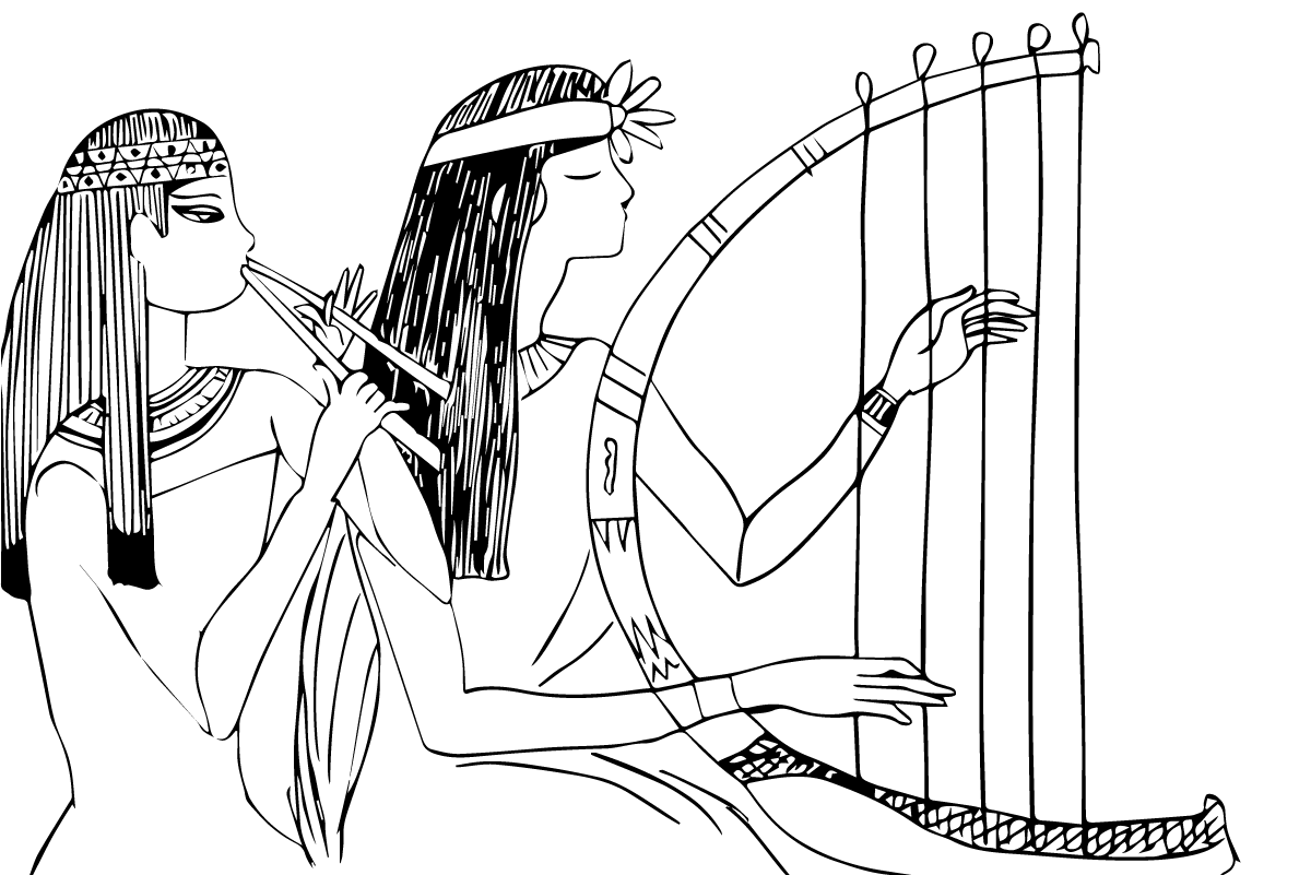 Drawing with two Egyptian woman playing music with flutes and harp. The slave women played many musical instruments in ancient Egyptian society. Illustration of ancient Egyptian art. Several versions. Download the image files in vector, scalable and editable SVG format to modify and adapt your illustration design.