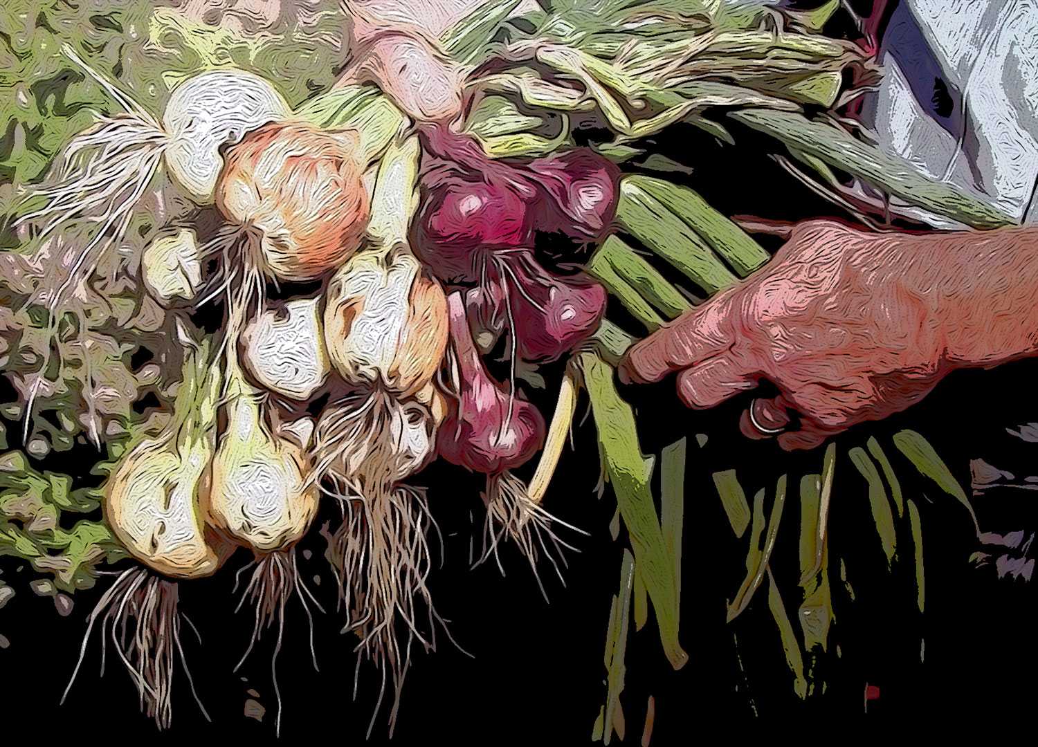 Ilustración con unas manos que sostienen unas cebollas desde los largos tallos. Se pueden ver las formas redondas de las cebollas y las raíces arrancadas de la tierra por el agricultor. Efecto óleo.