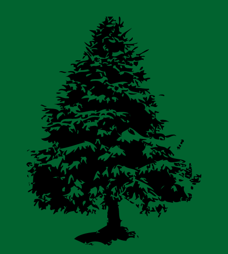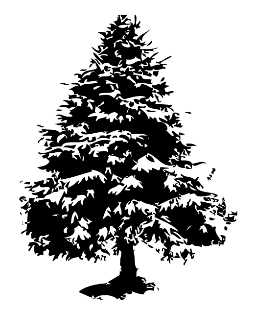 Ilustración con colores verdes, azules, grises y blanco de un árbol Abeto. Figura completa del árbol que tiene nieve en sus ramas.