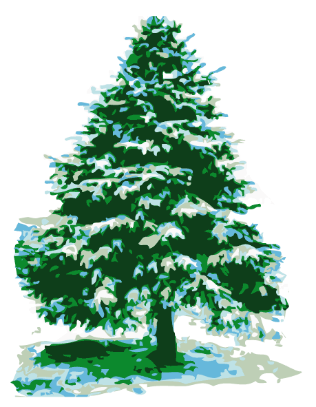 Illustration with green, blue, gray and white fir tree. Full figure tree that has snow on its branches.