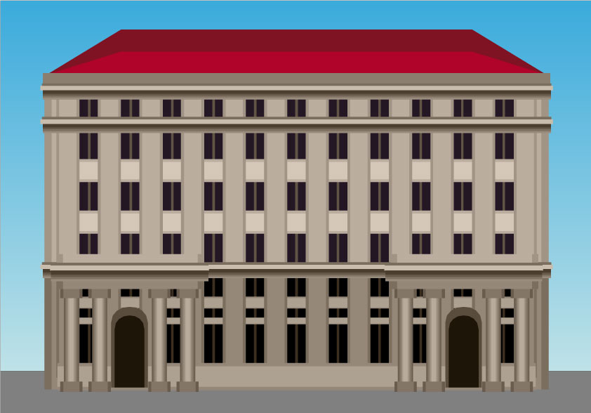 Ilustración de un edificio sólido, grande, de estructuras simétricas y estilo clásico o renacentista. Dibujo de la fachada, con tejado rojizo, con ventanas cuadradas y columnas en la parte inferior. El archivo se puede descargar en SVG, de modo que formas y colores serán editables.