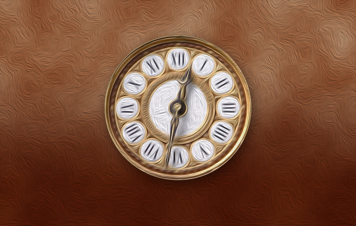 Illustration with a large round clock on the wall. The numbers on the clock are Roman. All created with circles. Two versions of the image. Oil painting effect.