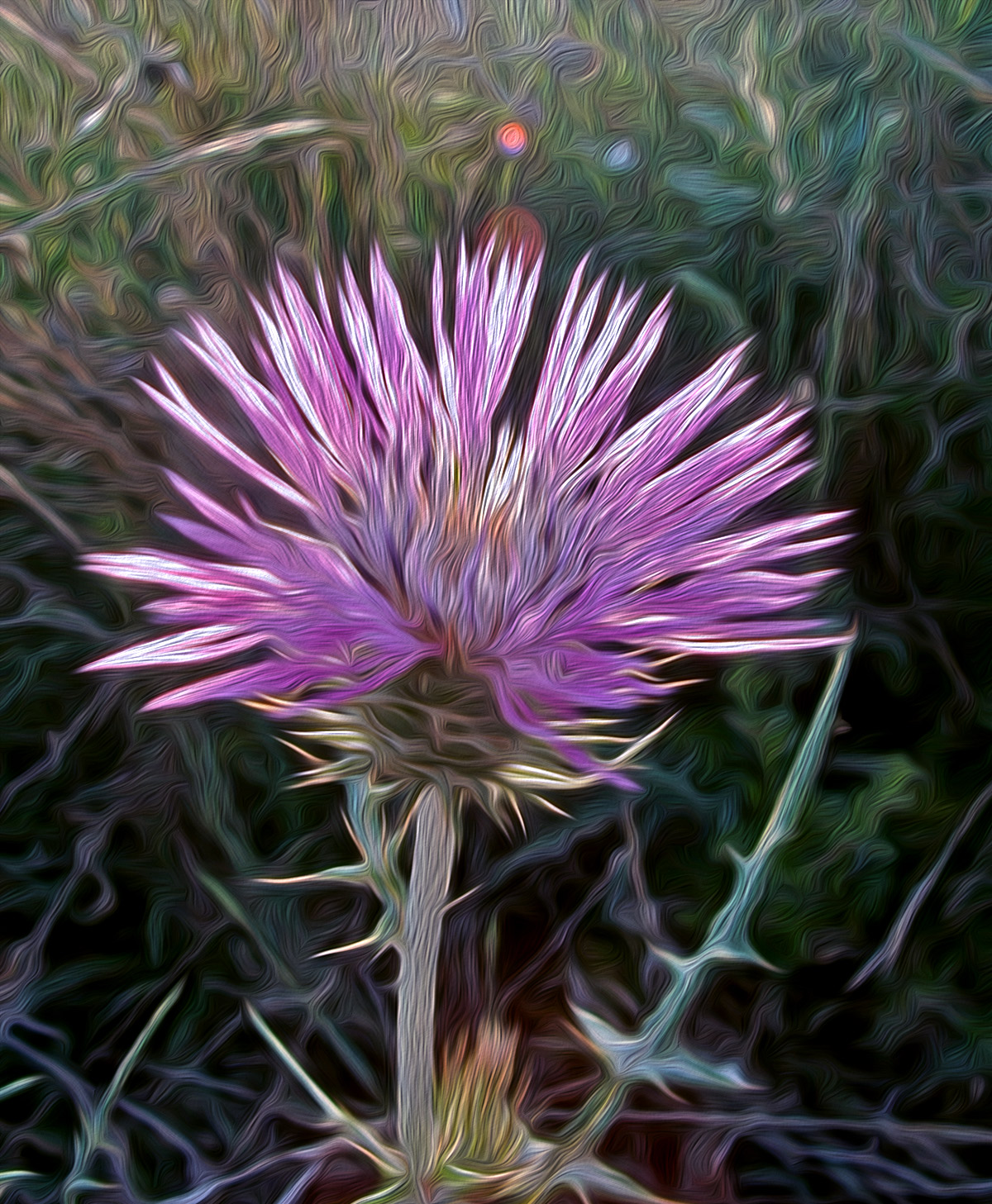 Pintura digital de esta flor tan especial, con pinchos, formas alargadas y colores violetas. Una flor silvestre y salvaje muy bella. El fondo tiene colores verdes oscuros.