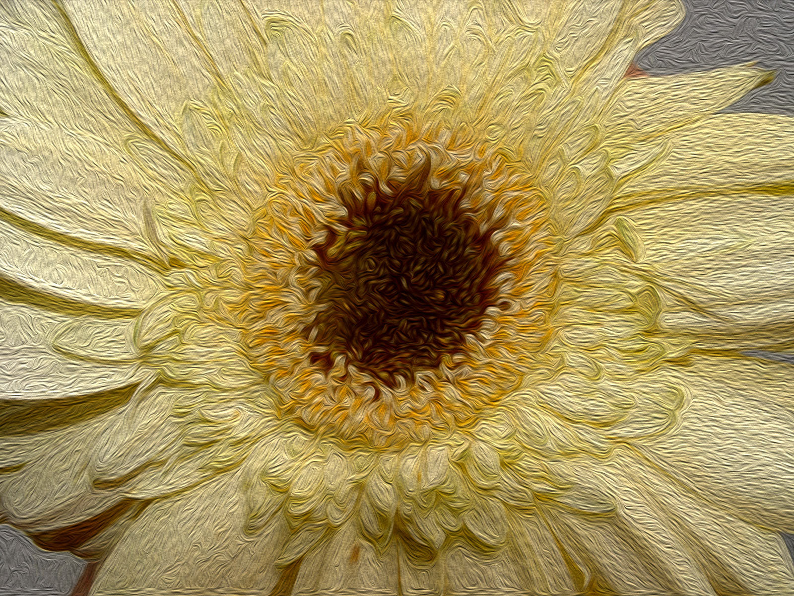 Digital painting oil to the center of a beautiful yellow daisy. The small but moving strokes draw the stamens and pistils. The petals are of a very pale yellow. A digital illustration of a flower center.