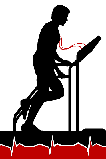 Ilustración de un chico que corre sobre una máquina de gimnasio. Con un aparato de medición del pulso. Dibujo del deportista de perfil, en colores blanco, negro y rojo. Un dibujo sobre el deporte, los deportistas, la salud y su cuidado en gimnasios.