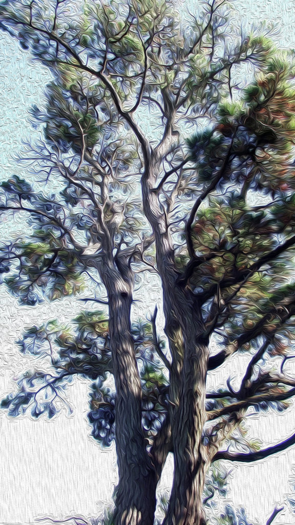 En esta ocasión, presento varias imágenes con el mismo tema. Un gran pino alto y delgado. Tres archivos diferentes se pueden descargar. La fotografía original, la pintura digital y una imagen de fondo con el diseño gráfico.