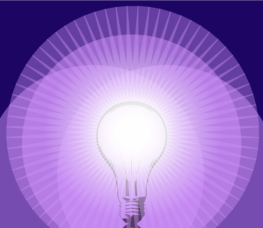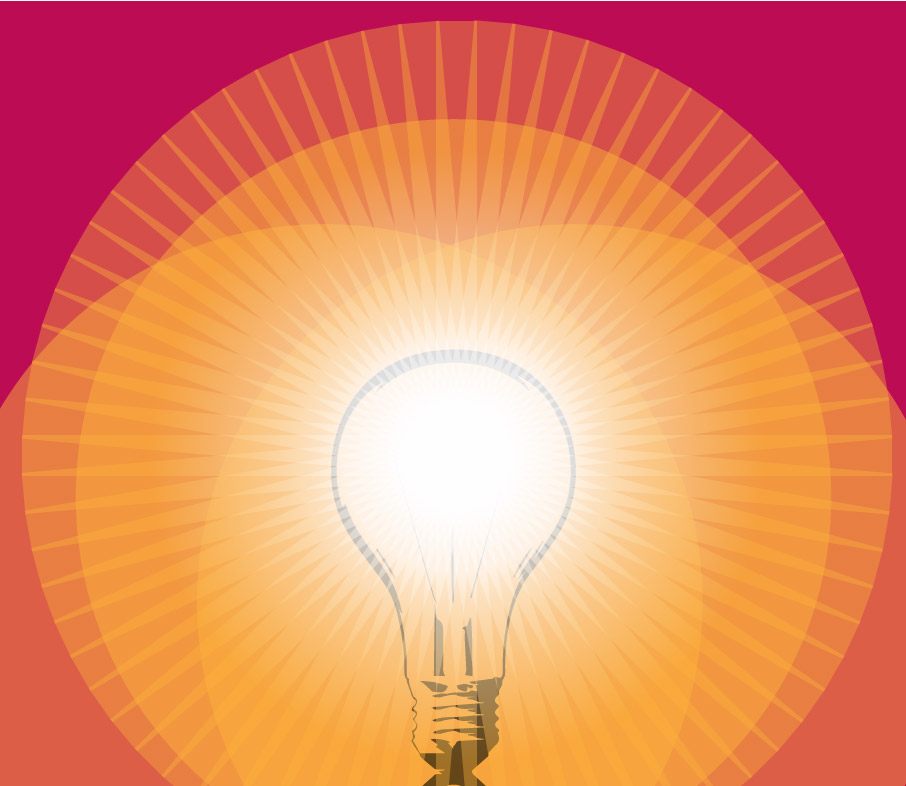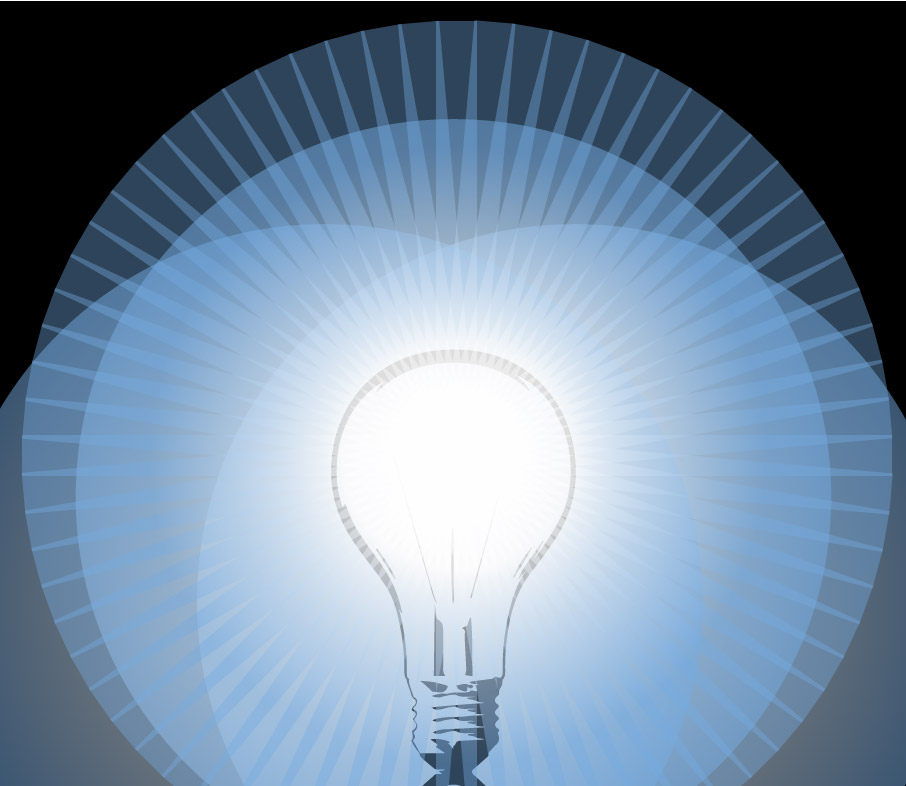 Ilustración con el dibujo de una bombilla en el centro y formas iluminadas. Descargar el Archivo en formato SVG vectorial, escalable y editable.