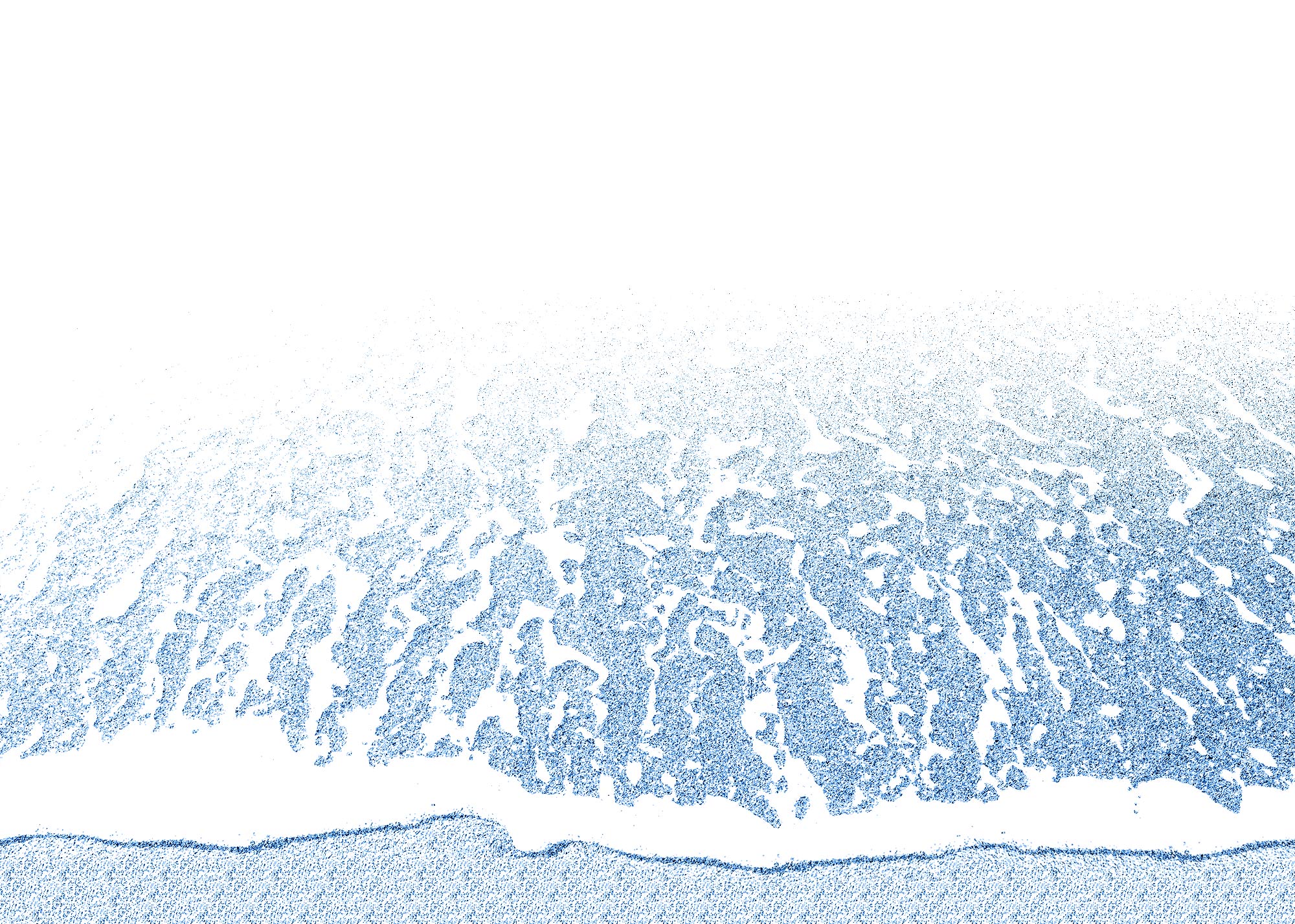 Ilustración con una ola sobre la arena de la playa. La espuma del mar flota en el agua y crea formas abstractas. La ilustración tiene un efecto de dibujo estilográfico con tonos azules.