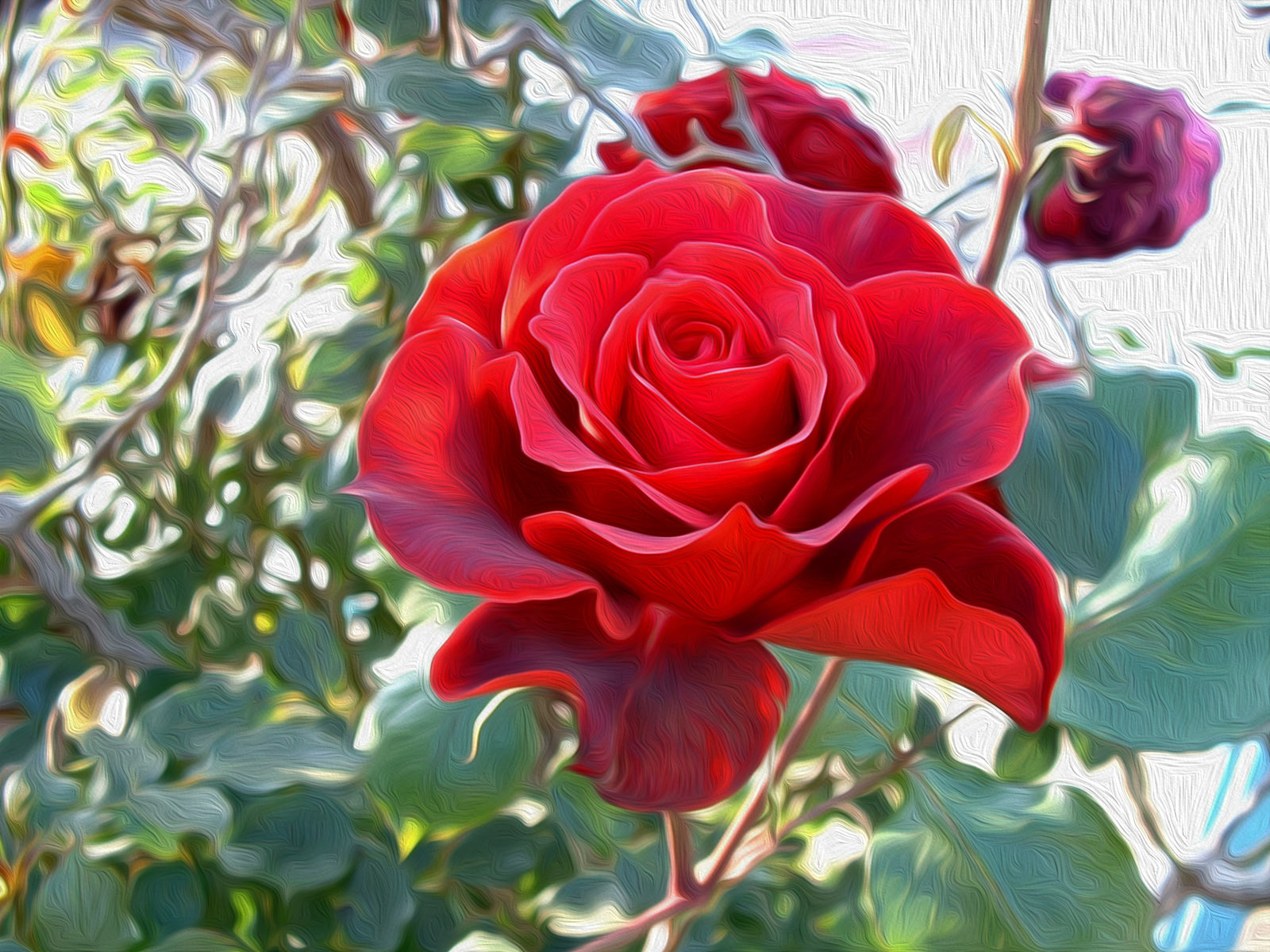 Big strong red roses scarlet, deep red. Style very soft brushstrokes oil. Digital painting.
