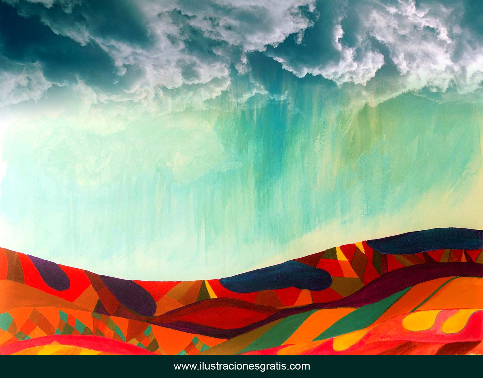 Grandes nubes dejan caer su lluvia hacia la tierra. Las montañas de colores rojos, ocres, naranjas, morados y verdes, tienen también colores azules, por el agua recibida. Una ilustración colorista de la lluvia sobre la tierra. Descarga el archivo de imagen en formato JPG.