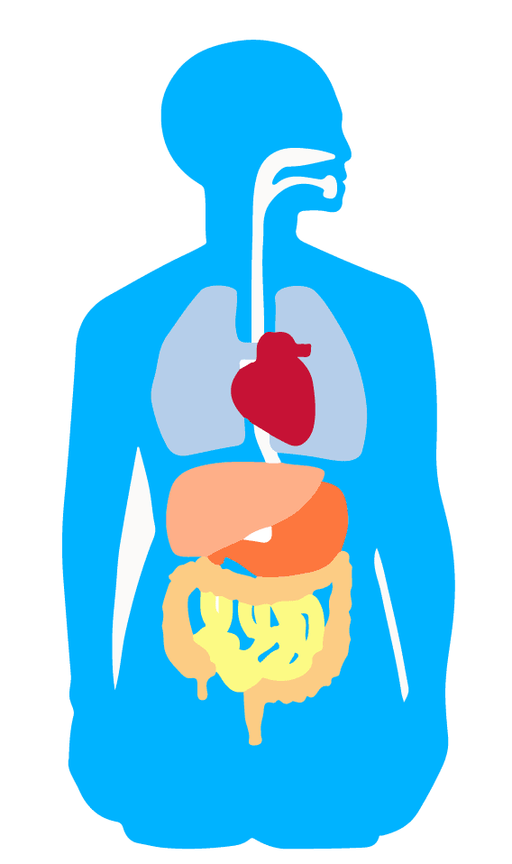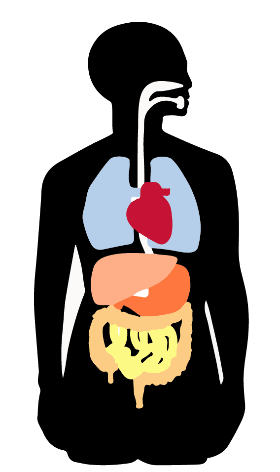 Illustration avec la silhouette d’un être humain, et dans plusieurs de ses organes vitaux, de l’œsophage, le cœur, les poumons, le foie et les intestins. Télécharger le fichier image au format GIF et le format SVG.