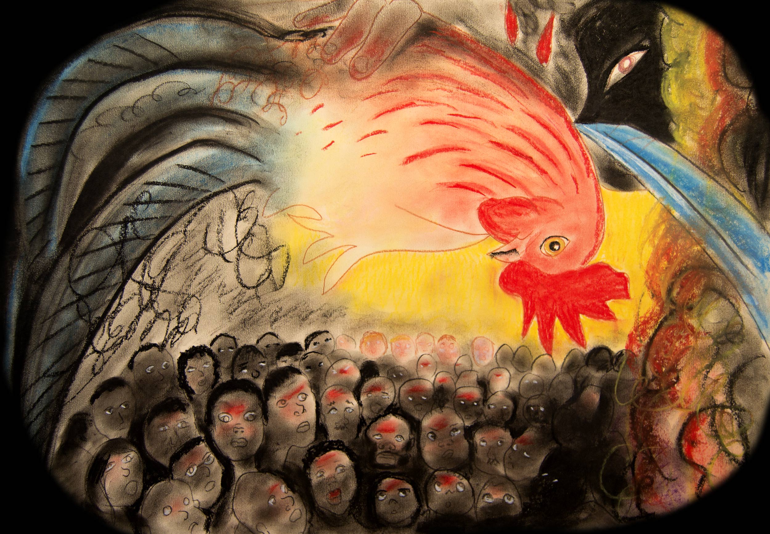 Una multitud de gente se puede ver bajo el espectáculo de la matanza del gallo. Los rostros de las personas son repetitivos, con cabello negro, ojos blancos y unas líneas rojas en la cabeza.