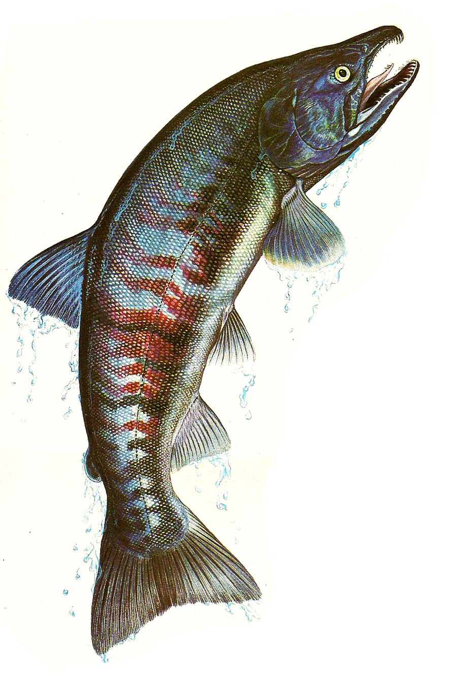 Dessin d’un saumon sauvage impressionnant et coloré en sautant hors de l’eau. Le gros poisson a une grande bouche et un corps solide avec ailettes gouttes d’eau. Très élaborer dessin des écailles de poisson. Coloré avec différentes teintes dans tout le corps.
