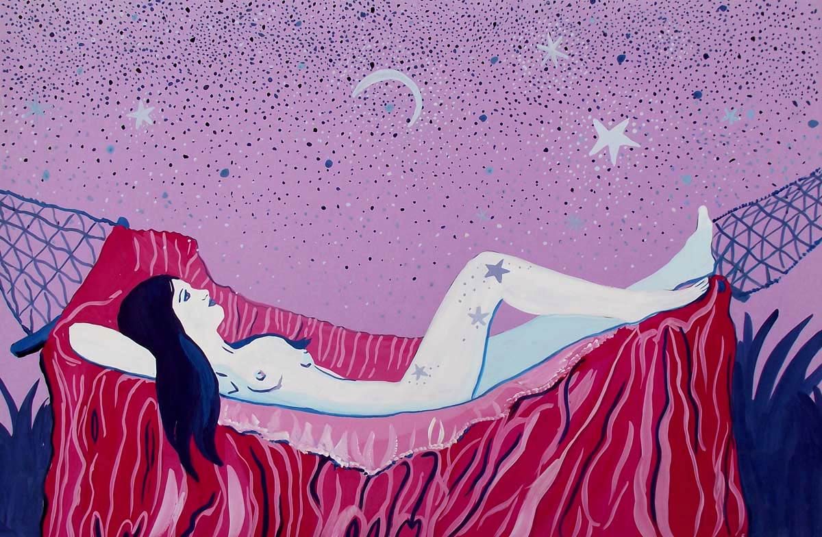 Esta pintura la realicé con pinturas Gouche. Hace tiempo la publiqué con el título «Soy libre», pero me gusta también nombrar la hamaca colgante. Se trata de una chica morena tumbada sobre una cama o hamaca colgante sujeta por los lados. La chica está sin ropa y descansa mientras contempla el cielo estrellado con una tranquilidad y paz inmensas. Su piel blanca resalta sobre una tela rojiza. Los colores son violetas, rosas, azules y blancos. El cielo tiene estrellas y una luna creciente que forma una esfera cortada.