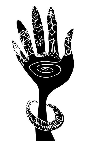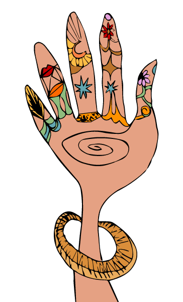 Ilustración con una mano plana, con sus cinco dedos extendidos hacia arriba. La mano contiene decoraciones y accesorios étnicos. Formas de estrella, anillos, elementos decorativos de estilo africano, árabe y de la imaginación. Varias versiones de la ilustración, en blanco / negro y en colores.