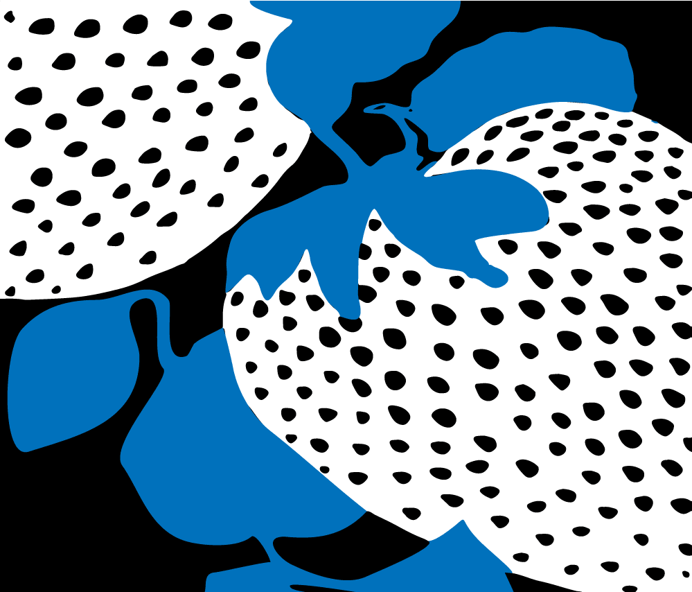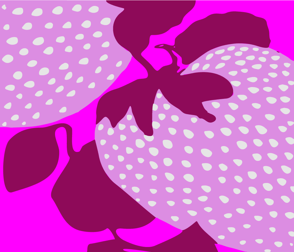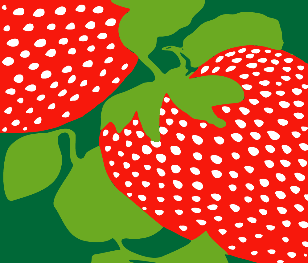 Ilustración estilo moderno vectorial con las formas de unas fresas, dibujadas sus pequeñas pepitas o semillas y con algunas hojas verdes.