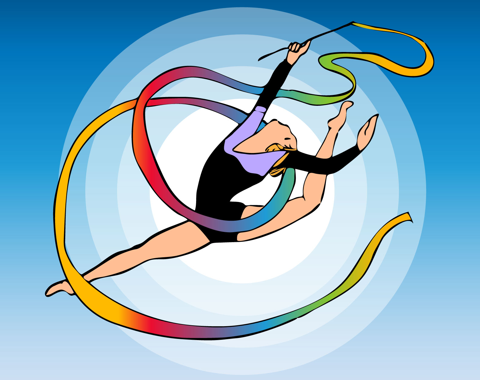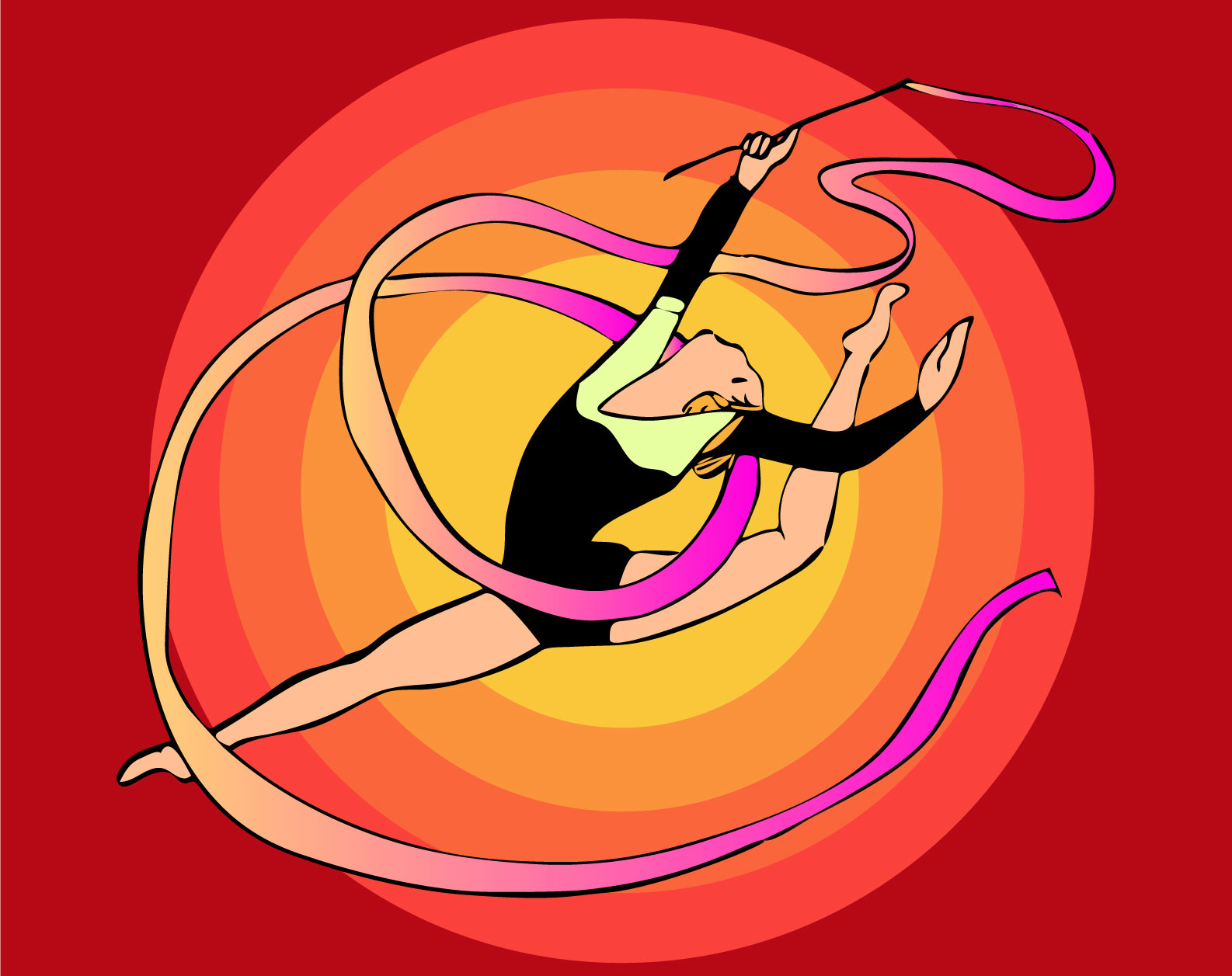 Ilustración con una chica gimnasta dando un gran salto en su actuación. Una mujer deportista estira sus piernas y brazos mientras ella sostiene la bara con la cinta. Dibujo sobre la gimnasia rítmica con cinta como deporte de gran belleza. Baile, ritmo y deporte. Varias versiones del dibujos en colores y blanco y negro. Descarga el archivo de imagen en formato vectorial SVG, escalable y editable, para modificar la ilustración y adaptarla a tu diseño.