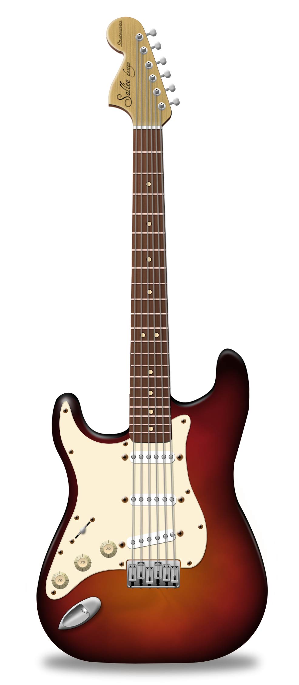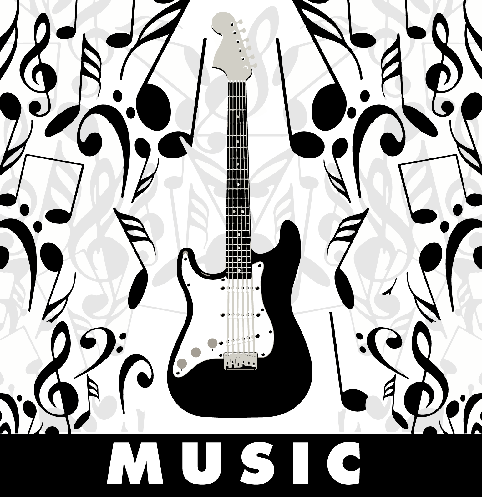Illustration on white, black and gray with a picture of a Fender Stratocaster guitar. In the background, musical notes flying through space.