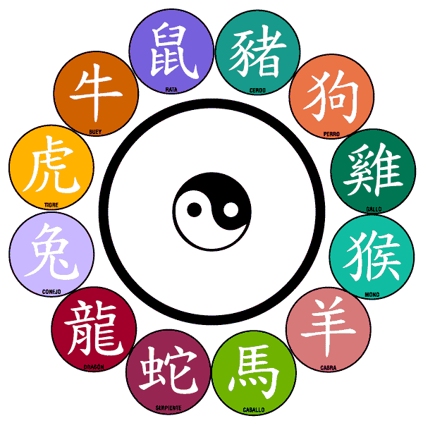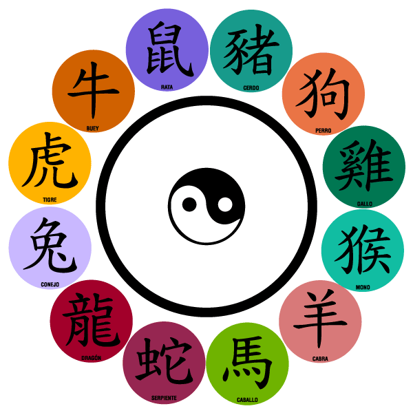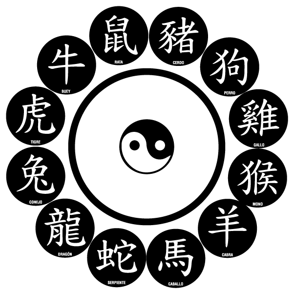 Ilustración en círculo con las letras chinas que simbolizan los doce signos del zodiaco chino. El tigre, la serpiente, la rata, el perro, el mono, el gallo, el dragón, el conejo, el cerdo, la cabra, el caballo y el buey.