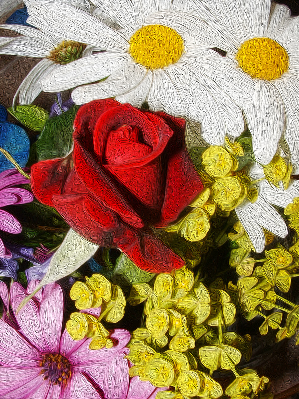 La belleza de las flores de colores fuertes y alegres de esta pintura digital resalta por la unión de varias flores como son la rosa y las margaritas. Pinceladas pequeñas y con textura. Imagen sea suave y tierna. Unos colores vivos pero armónicos.