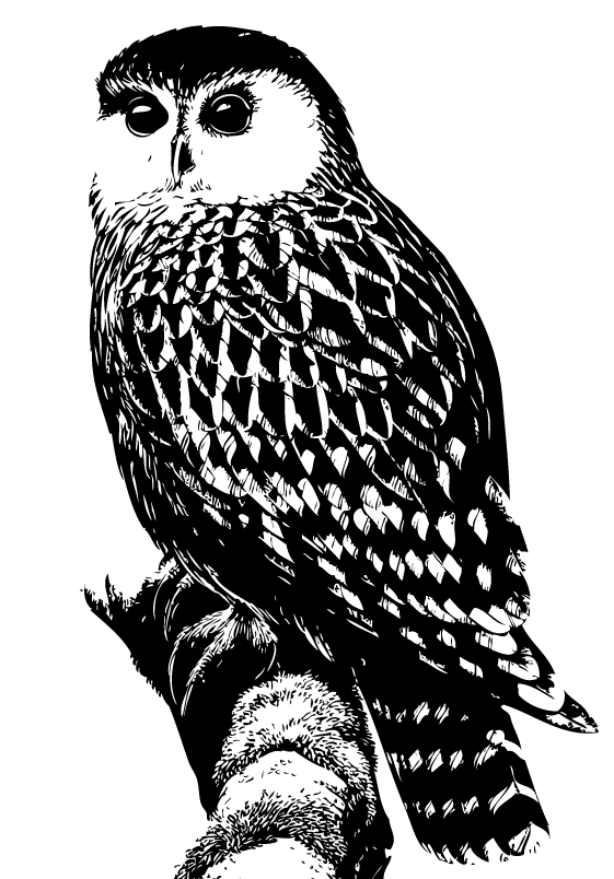 Collection illustrations in Chinese ink. Illustration of an owl resting on a branch This is a drawing created in the black and white India ink style. In this illustration we can see the folded wings of the owl with the detailed drawing of all its feathers, of great beauty and balance. The owl has its eyes open and turns its head to its left side. The bird is perched on a branch of a tree. Directly download the illustration for graphic design in GIF format. Royalty-free illustrations. Cristina Alejos creations.