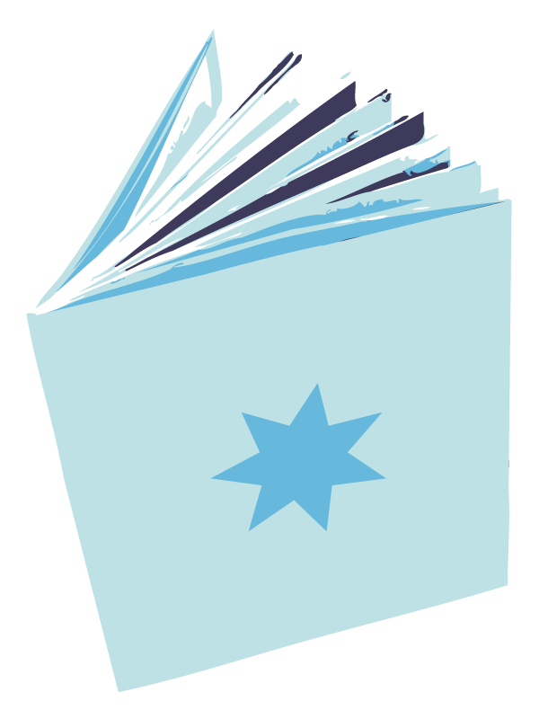 Esta ilustración muestra un libro colocado de pie. La portada tiene un dibujo con una estrella. Es un pequeño libro, una agenda, una libreta de apuntes o un cuaderno de notas. El libro está medio abierto y podemos ver las formas de las hojas.