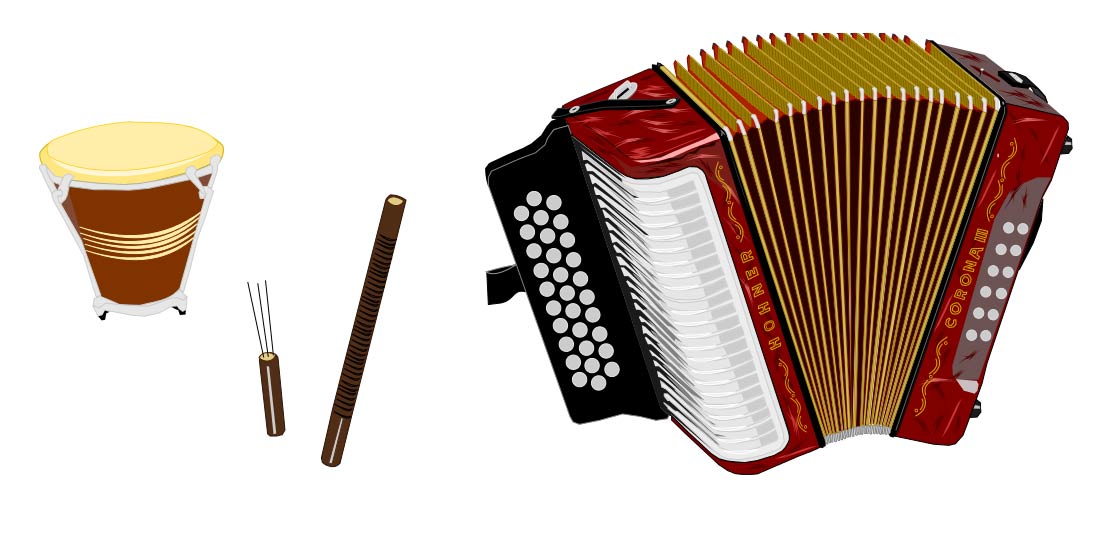 Imagen con varios instrumentos musicales “del vallenato”. Un gran acordeón, un pequeño tambor y otros útiles.