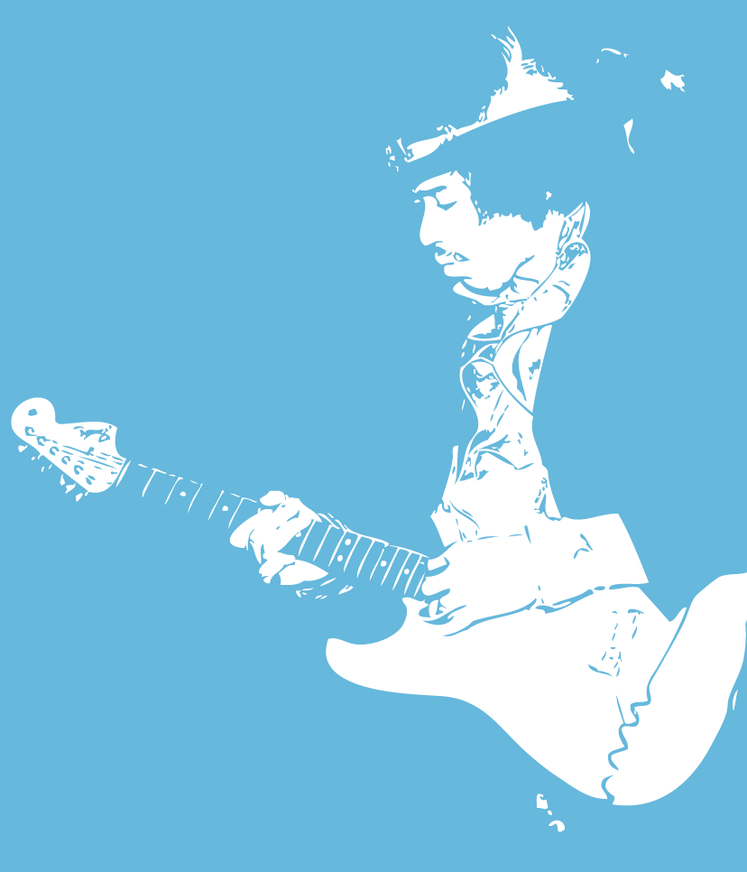 El gran guitarrista Jimmy Hendrix en concierto. Ilustración de dos tonos. El blanco define la figura del músico y su guitarra. Versión con fondo azul.
