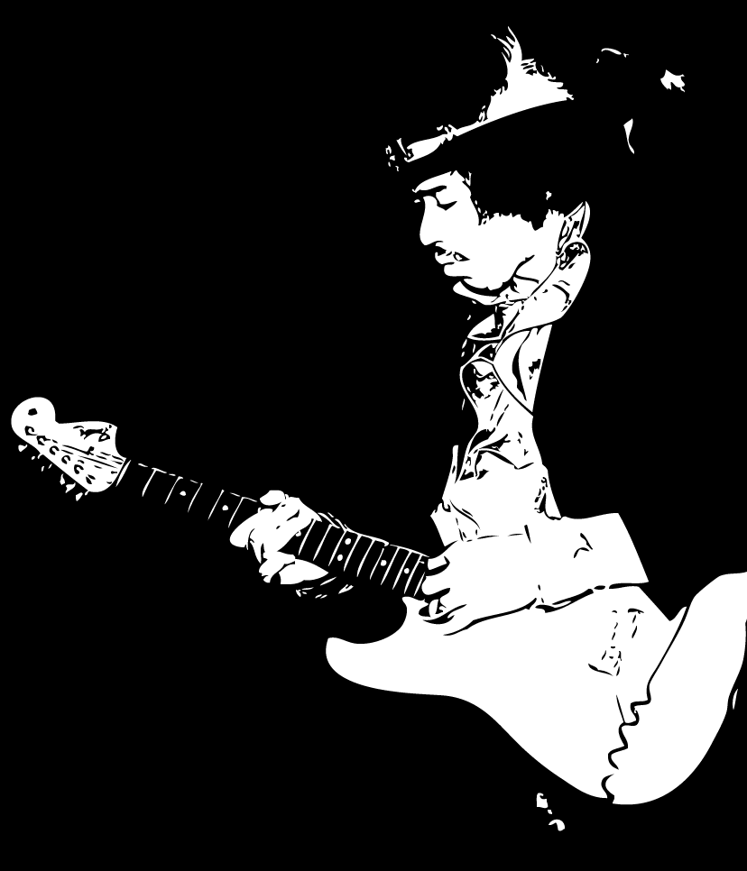 The great guitarist Jimmy Hendrix at a concert. Illustration of two tones. White defines the musician and his guitar.