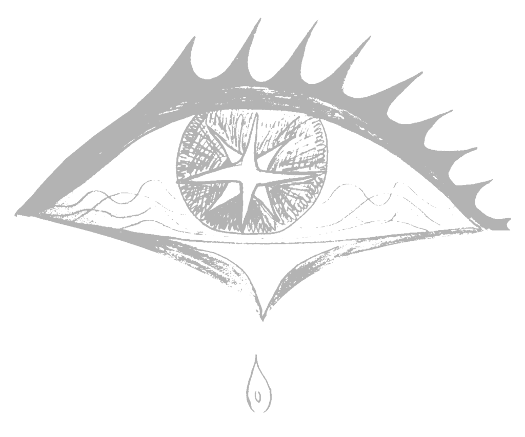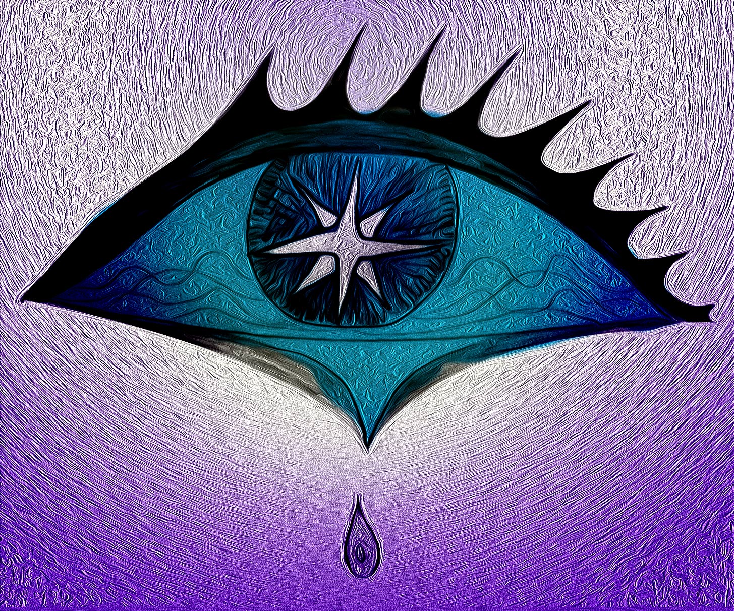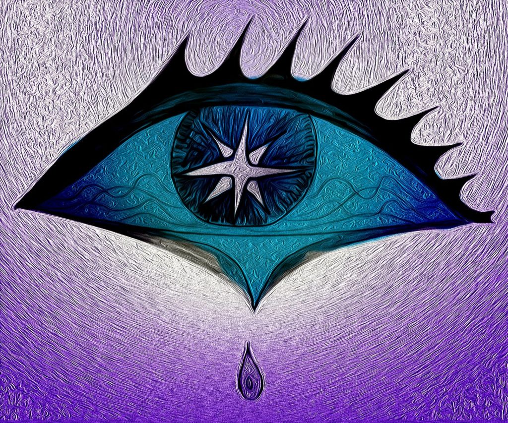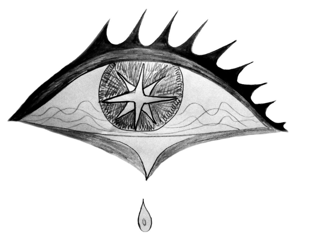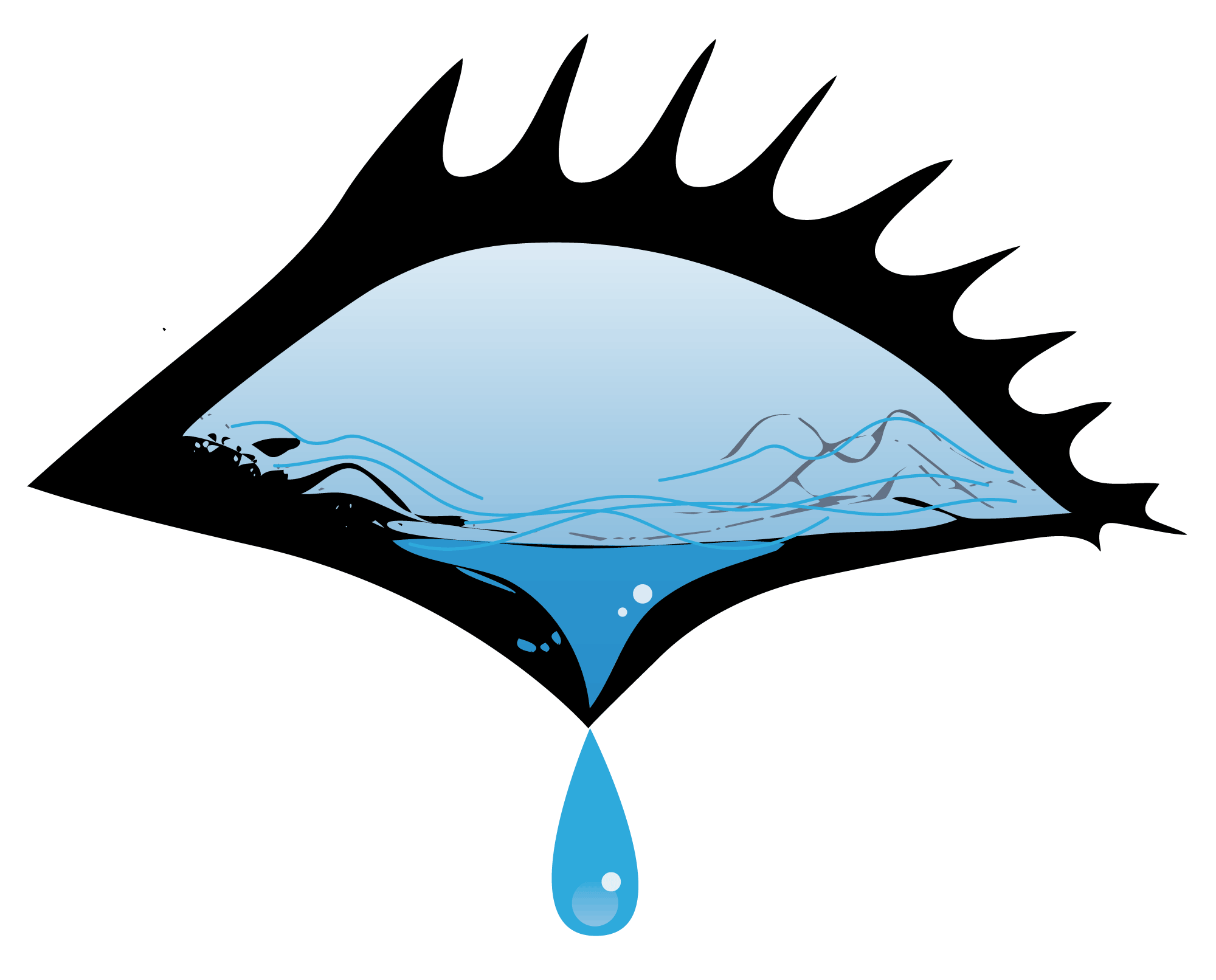Dibujo vectorial con la forma de un ojo del cual cae una lágrima azul. Las pestañas son negras, fuertes y muy sólidas, rodeando la forma del ojo. EL globo ocular es azul porque está lleno de agua. No hay iris ni pupila en este ojo lacrimoso.