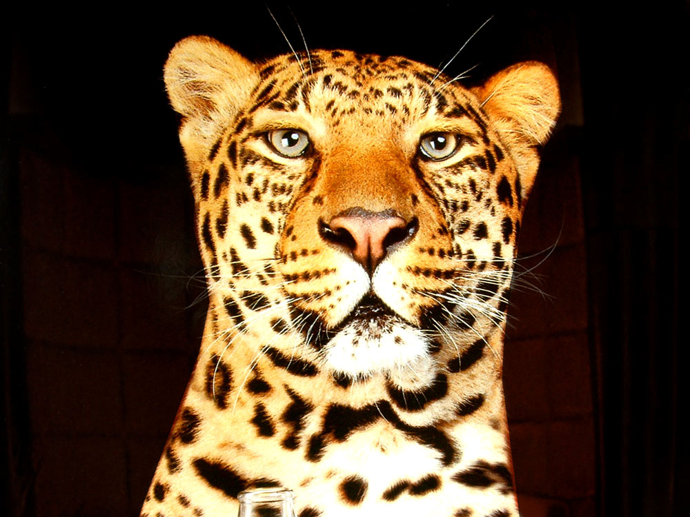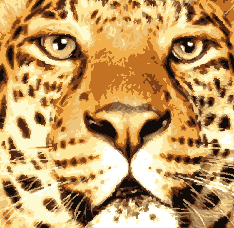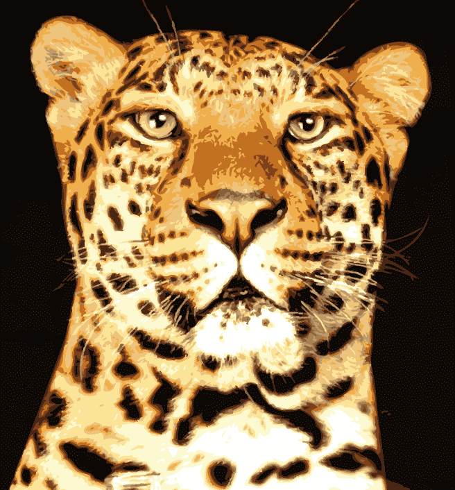 Closeup of the face of an adult leopard, looking at camera. Illustration of the animal with big eyes cats, mottling and thick fur. Several versions.