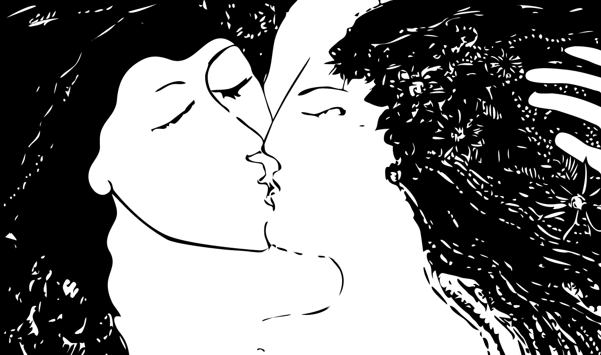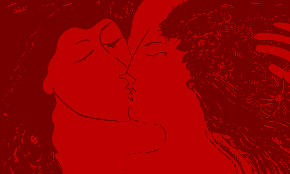 Ilustración con el beso de una mujer y un hombre. Románticos, cariñosos y delicados, la pareja se da un beso de amor. Dibujo en blanco y negro y con tonos rojos, ideal para las fiestas de San Valentín. Descarga el archivo de imagen en formato vectorial SVG, escalable y editable, para modificar la ilustración y adaptarla a tu diseño.