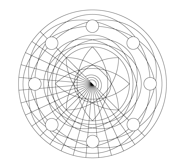 Dibujo con líneas negras sobre fondo blanco. El dibujo abstracto tiene unas formas geométricas similares a la flor de loto. Alrededor unos círculos entre-cruzados generan unos anillos circulares que rodean el centro del dibujo. Ilustración para colorear y meditar pintando. Se puede descargar el archivo en formato SVG vectorial, escalable y editable para obtener tamaños más grandes y con calidad.