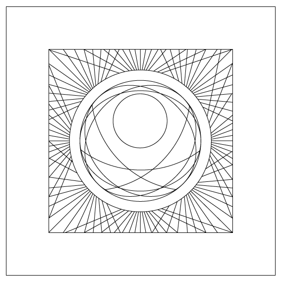 Dibujo con líneas negras sobre fondo blanco. Diseño de un mandala con formas abstractas y geométricas. En el centro hay una esfera que flota sobre otras formas curvas. Alrededor un anillo creado por dos círculos. Y en el fondo unas líneas en ramillete que nacen desde unos puntos situados bajo el anillo.