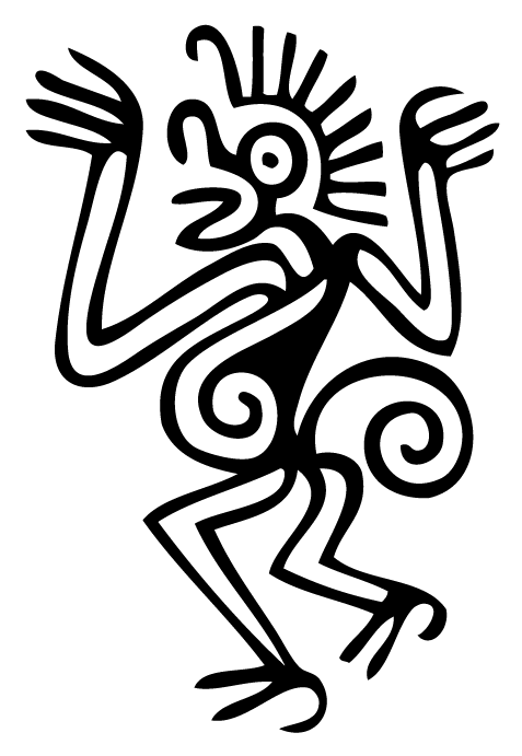Diseño con líneas negras sobre fondo blanco de la figura de un mono. Con sus brazos y piernas, una cresta en la cabeza, un largo rabo y una gran barriga. El mono camina y mueve sus brazos mientras parece gritar algo. Increíble diseño gráfico que fue creado en la sociedad azteca seguramente para un sello de identidad.