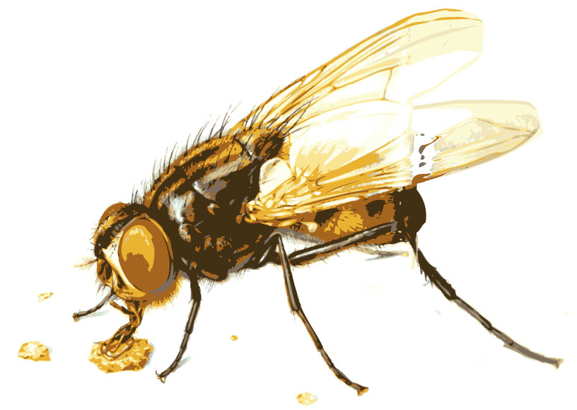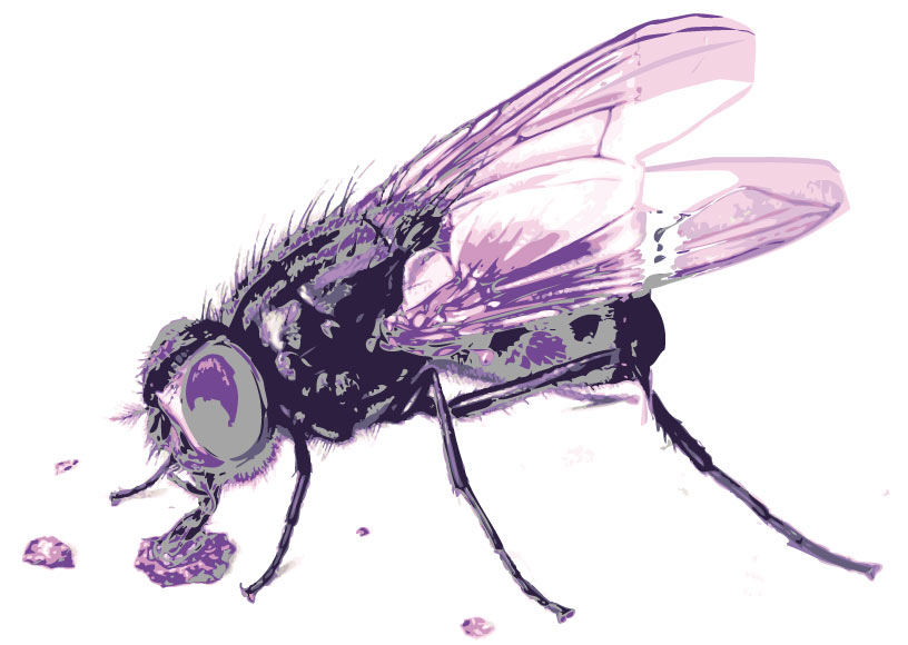Ilustración de una mosca con detalle de sus alas, sus pata y el tronco peludo del insecto. La mosca, de grandes ojos, saca su lengua para chupar un poco de líquido que hay en el suelo.