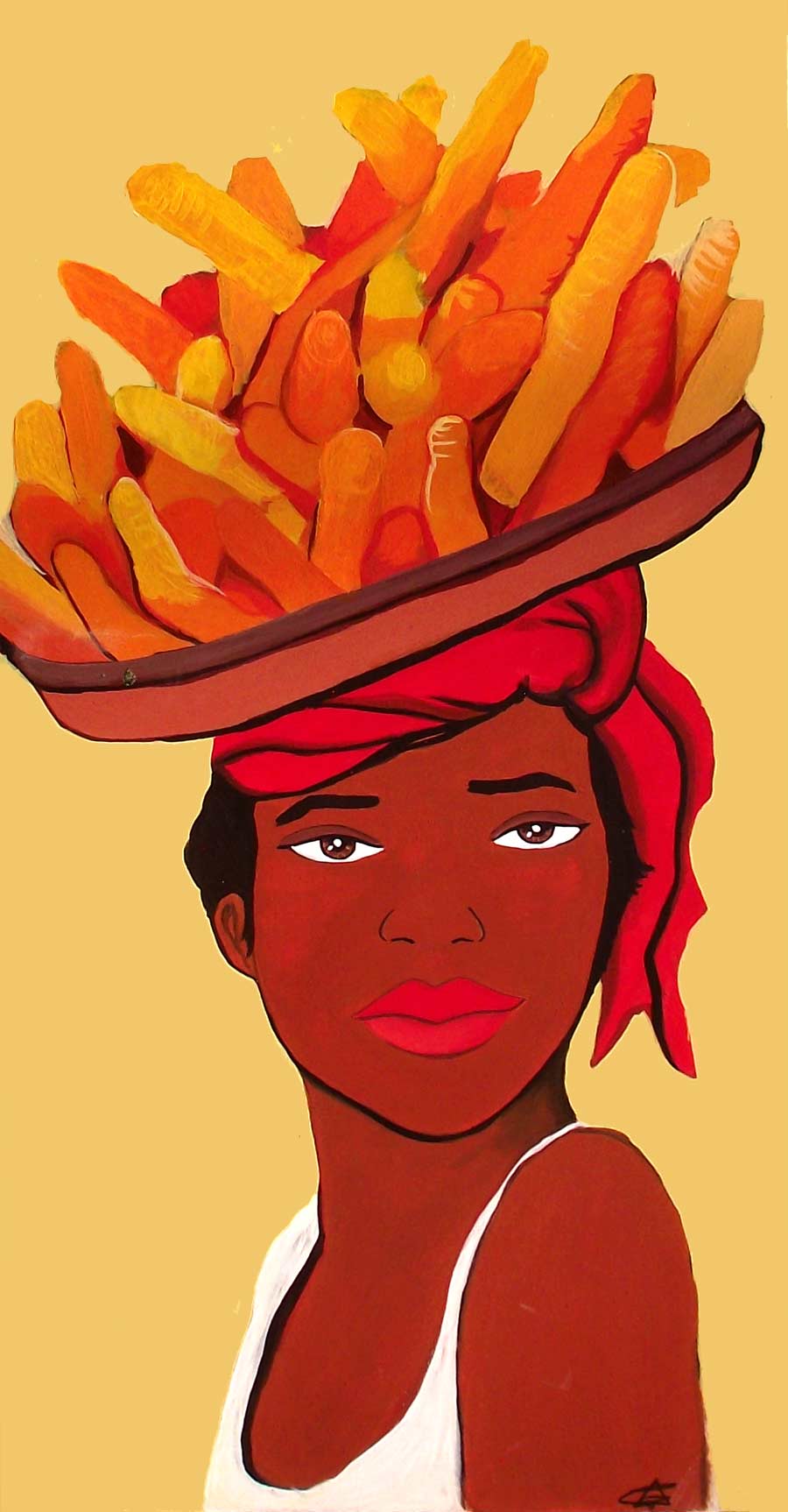 In this illustration an African woman carries a basket of carrots on her head. The woman wears a red turban or scarf. The colors that dominate are orange, yellow, red and brown. The young African woman wears a white T-shirt. Her eyes and her big mouth stand out on her face. Original painting created with acrylics. Download the illustration in JPG format to create your graphic designs.