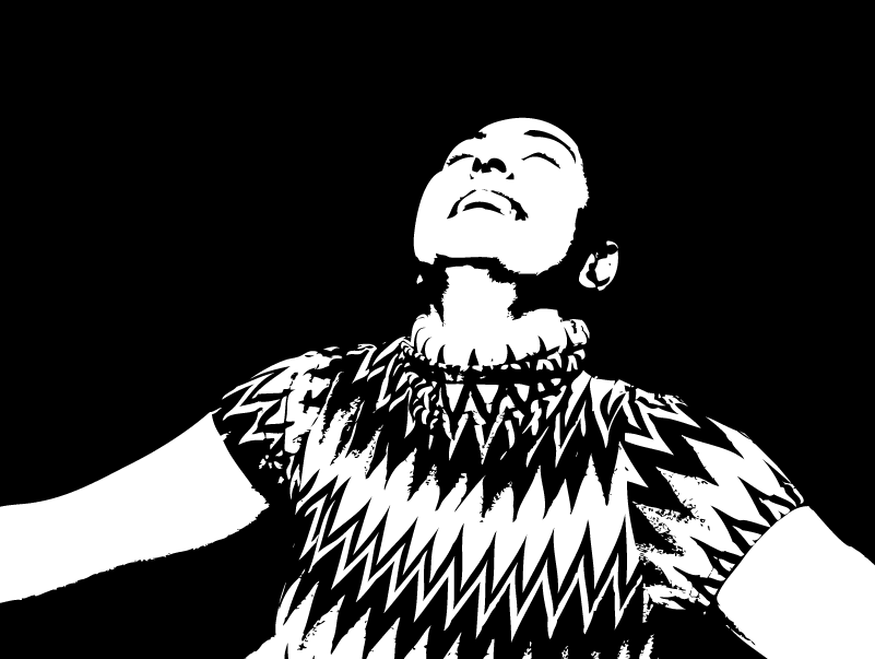 Dans ce dessin, une femme sourit en levant la tête vers le soleil, qui illumine son visage. Dessin expressif aux encres noir et blanc.