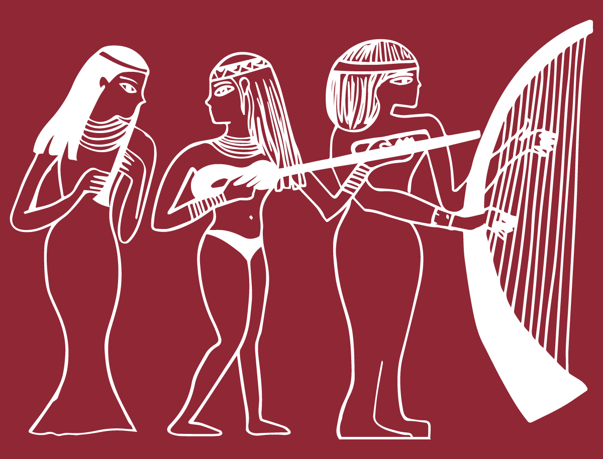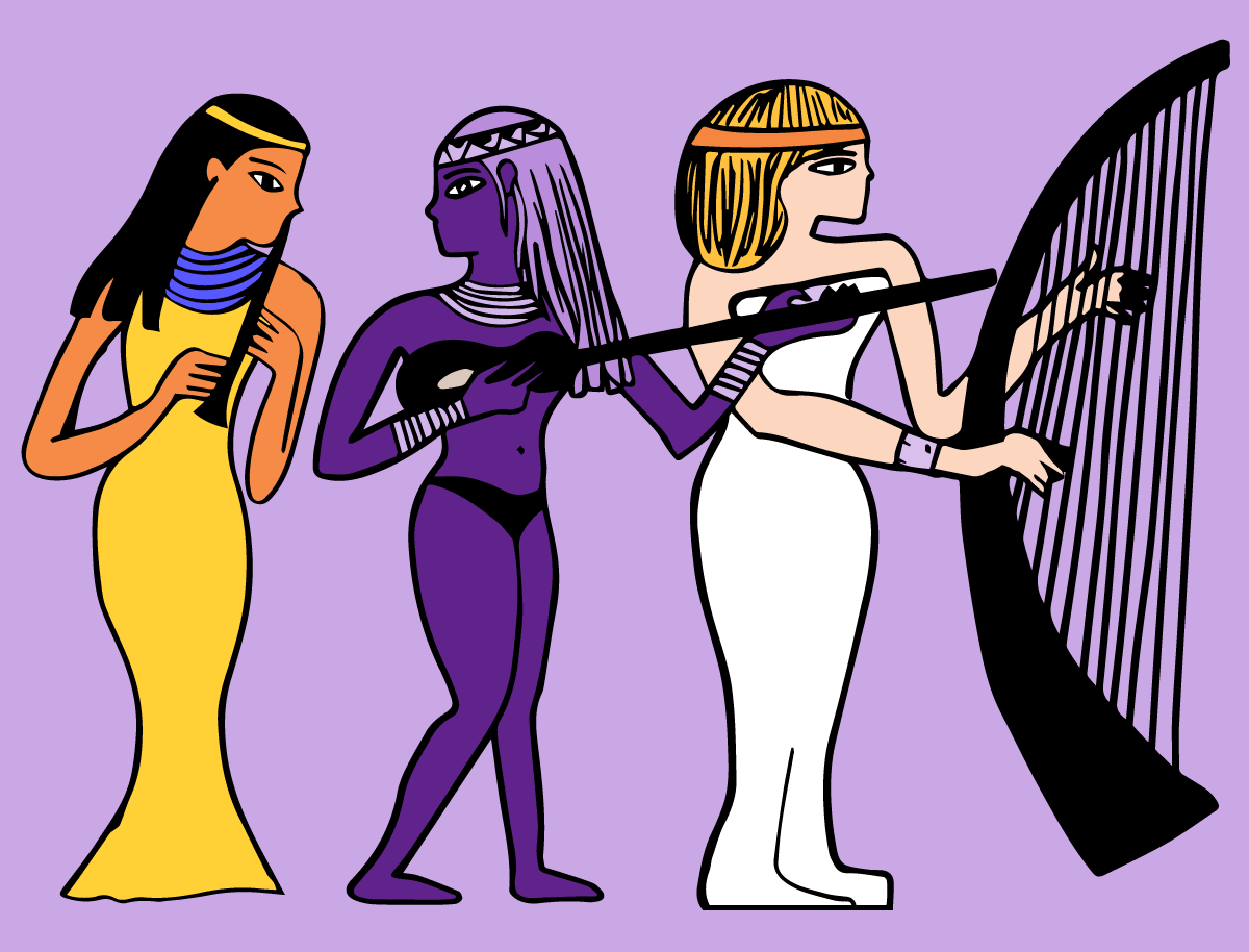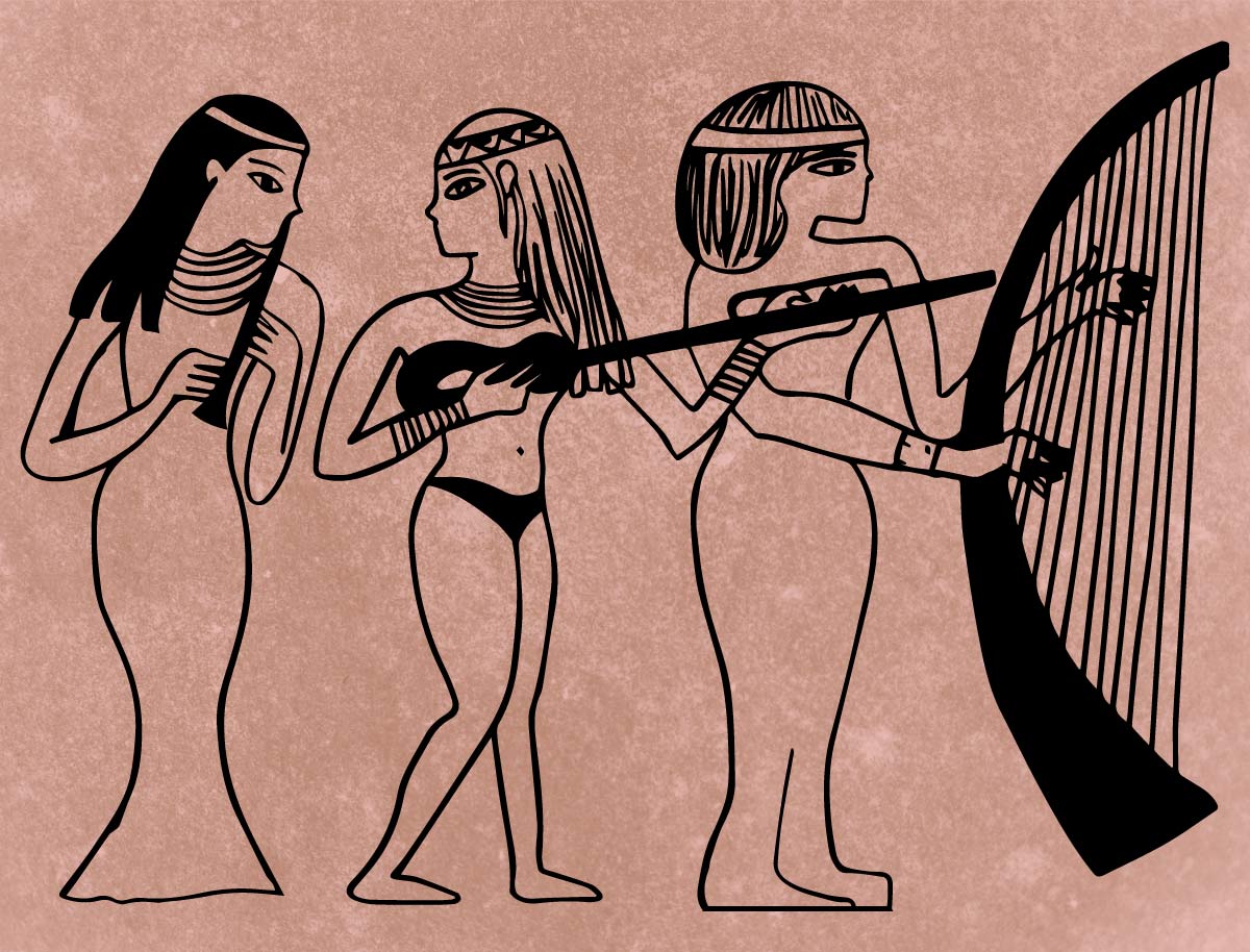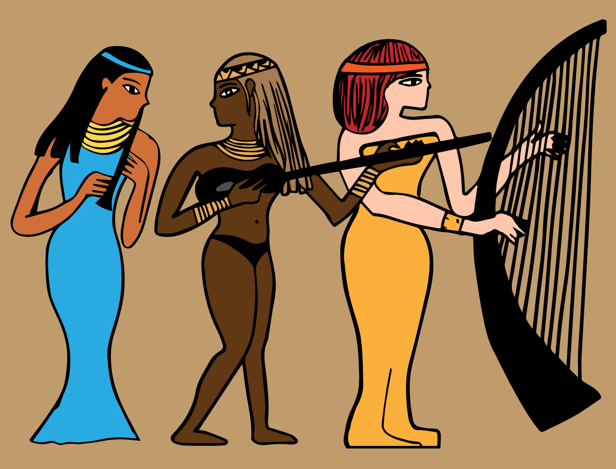 Dibujo con tres figuras femeninas egípcias tocando diversos instrumentos musicales. Las tres figuras están de pie, con cabezas y brazos de perfil, al modo egípcio. Varias versiones con colores, en blanco y negro y con una textura de fondo. Descargar el archivo en formato SVG vectorial, escalable y editable para modificar la ilustración y adaptarla a tu diseño.