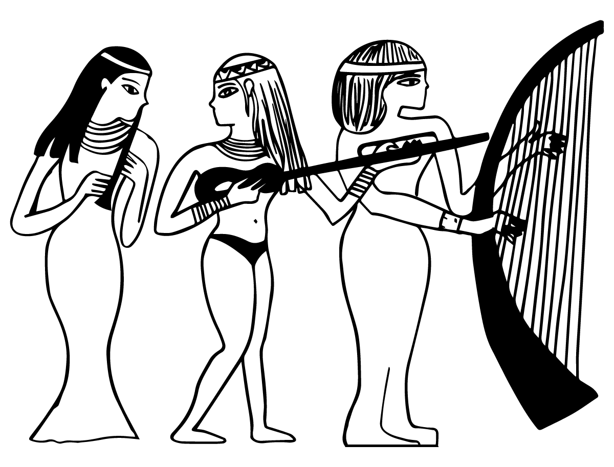 Ilustración de mujeres egipcias tocando música – Versión en blanco y negro