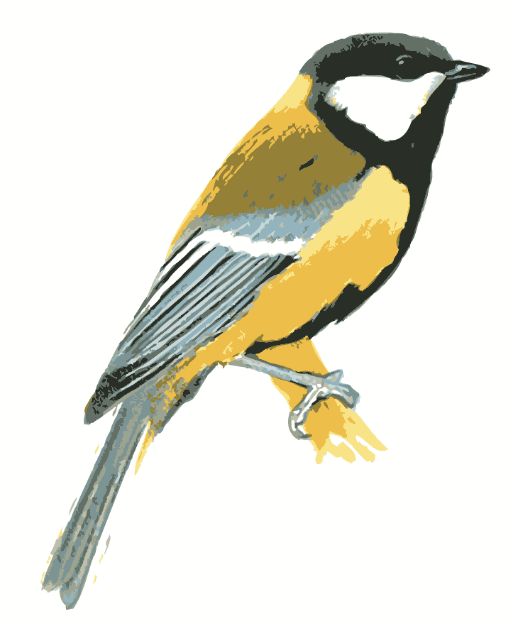 Llamado Cabernero común, este pájaro forma parte del grupo de pájaros páridos (Paridae). Son una familia de aves paseriformes que incluye los carboneros y herrerillos, y que se distribuyen por Europa, Asia, África y Norteamérica. En esta ilustración vemos un pequeño pájaro parido de perfil sobre una rama. Versión en color y en blanco y negro.