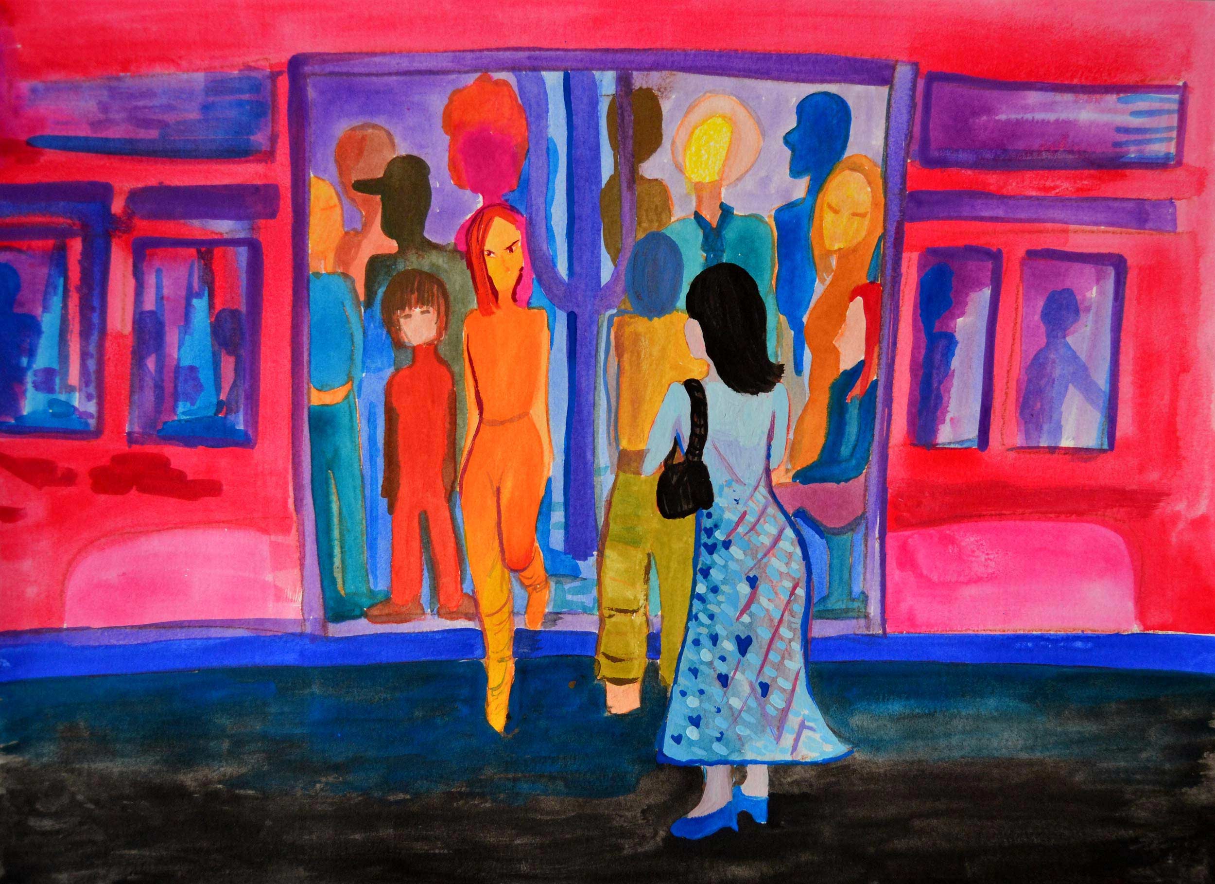 Brightly colored illustration featuring a Parisian metro station. The car full of people has stopped on the platform and people are getting ready to get off, while a woman is waiting for her turn to get on the train. The image also shows the subway windows and behind some shadows and lights with people. The colors used are pure and contrasted. magenta pinks, violets, oranges, blues and many other bright colors.