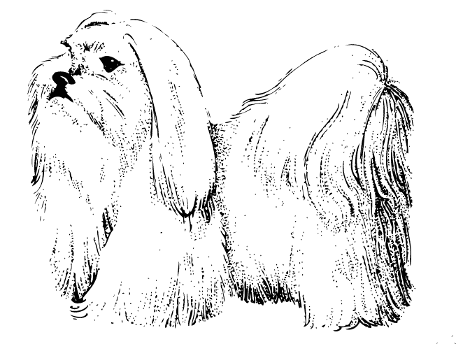 Antiguamente llamado “perro de las patricias romanas”, por ser su preferido. Vivaces e inteligentes, el maltés tiene un porte erguido con pelaje denso, brillante y pesado, incluso sedoso, con color blanco o marfil puro. El dibujo muestra un ejemplar con líneas suaves, ojos y ocico muy negros.